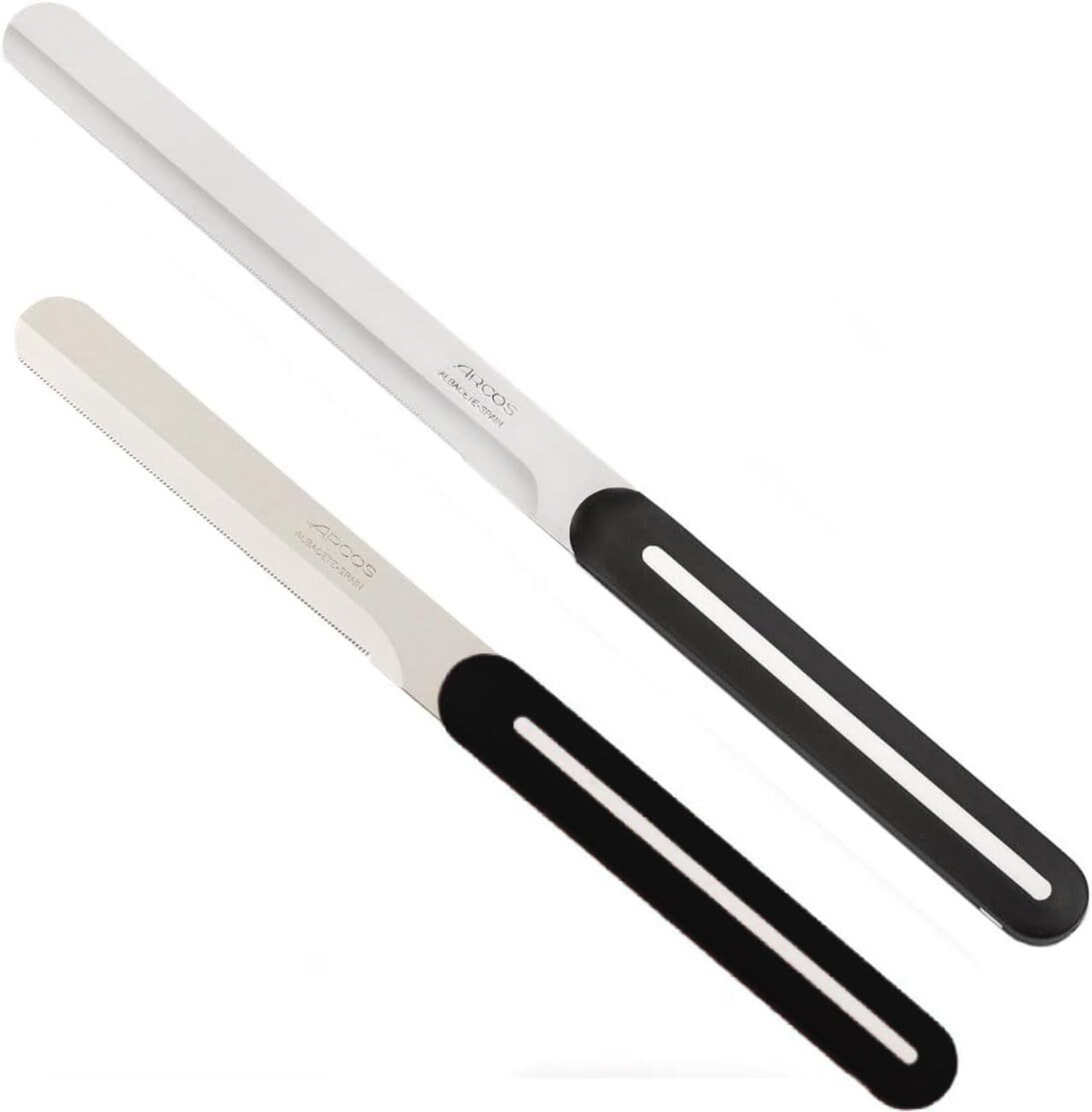 【新春セール】ARCOS アルコス テーブルナイフ & テーブルナイフロング 2本セット ギザ刃 スペイン製 食洗機対応 ニトラムステンレス鋼 (刃渡り10cm ブラック/ホワイトライン、15cm ブラック/ホワイトライン)