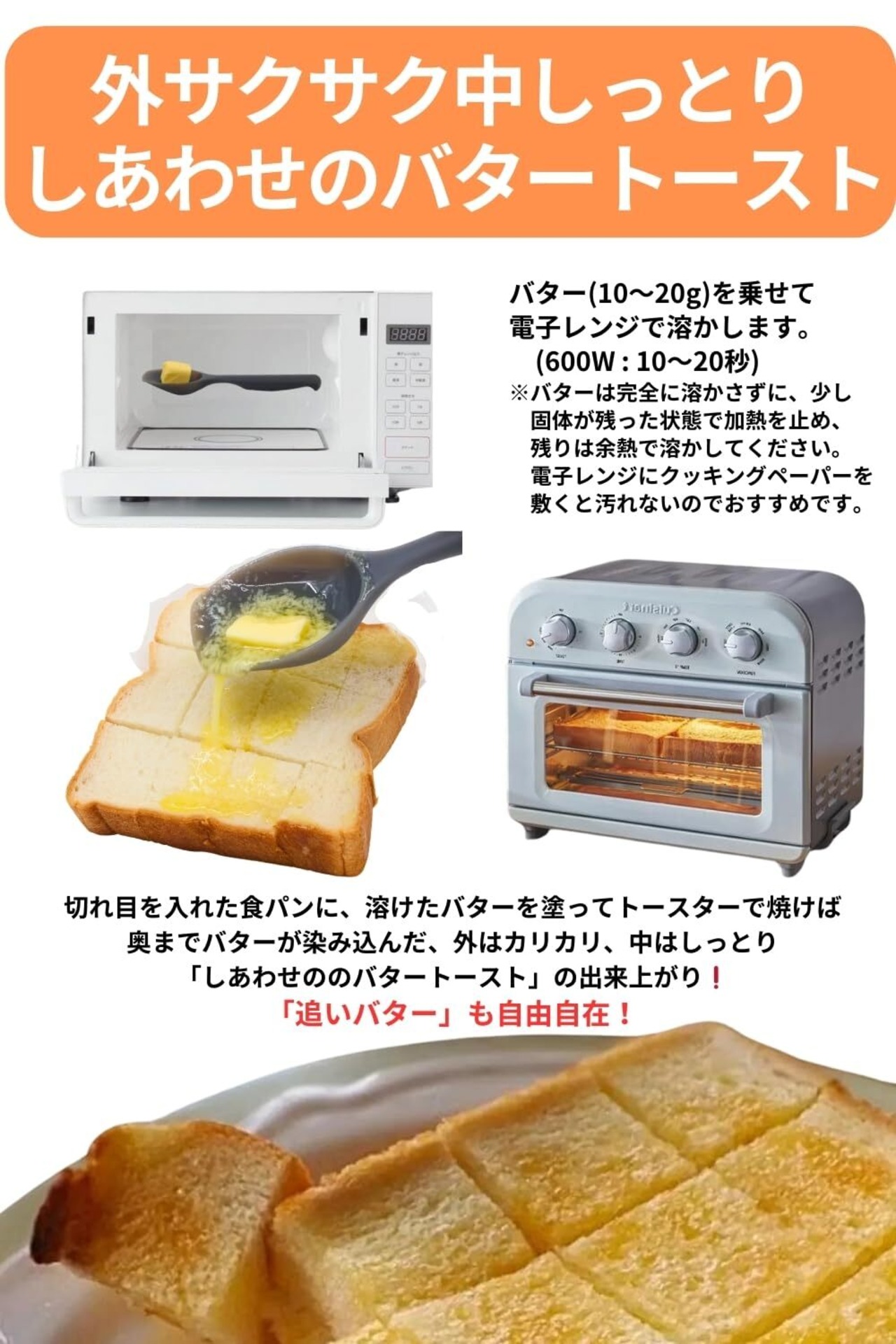 スプーン部分にバター(10〜20g)を乗せて、電子レンジで溶かします。(600W:10〜20秒) そのまま食パンに塗って、トースターで焼けば、奥までバターが染み込んだ、中はモチモチ外はサクサク「幸せのバタートースト」の出来上がり!