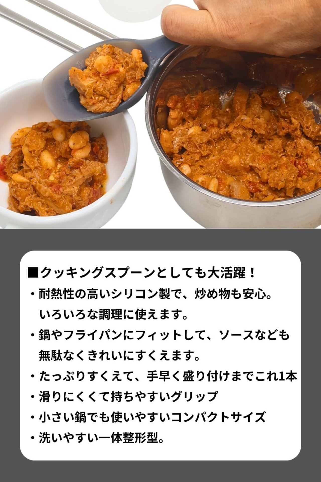 調理用スプーンとしても大活躍! 鍋やフライパンにフィットして、スクレーパーのようにも使えます。 炒め物や煮物、たっぷりすくえて、手早く盛り付けまでこれ1本でOK!