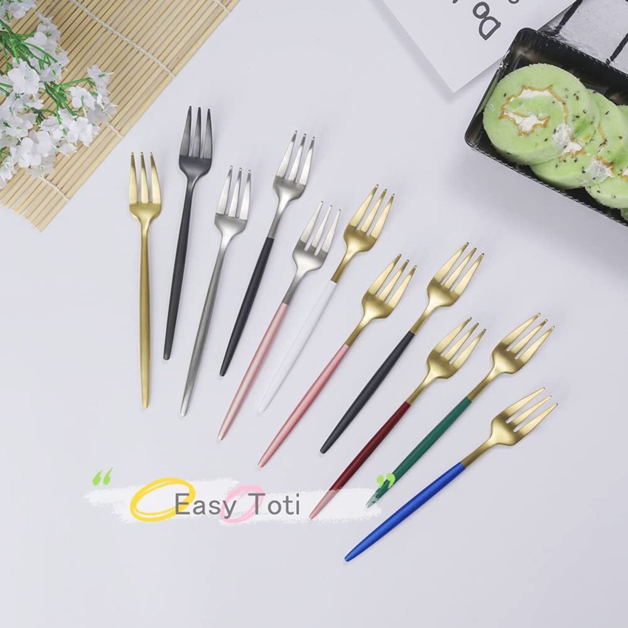 Easytoti フォーク ケーキフォーク デザートフォーク 5本セット13.5㎝ オシャレ 可愛い ミニフォーク 18-8ステンレス鋼製 つや消し 食洗機対応 シルバー/ブラック……