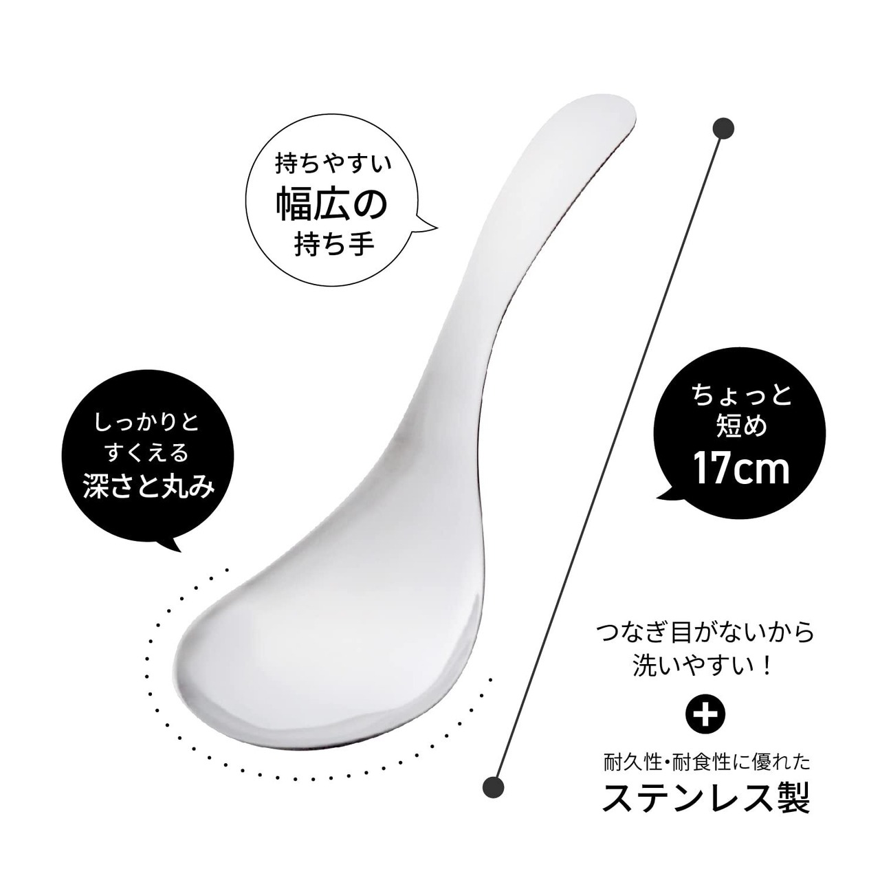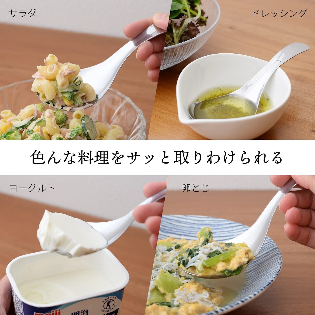 【絶妙サイズ】取り分け用のスプーンの持ち手がお皿から飛び出して邪魔だな…を解決する、全長17cmで少し短めだけど邪魔にならない「絶妙サイズの取り分けスプーン」。食器洗い乾燥機にも入れやすいサイズで、お使いになったあとの収納性が良いのも嬉しいポイント。【すくいやすい】しっかりとすくえる広くて深めのすくい部は、炒めものや煮物、サラダやドレッシングなどの液体までサッと取り分けることができます。【持ちやすい】持ち手部分は幅広だから持ちやすい。【お手入れカンタン】耐久性、耐食性に優れたステンレス一体設計で、汚れがたまりにくく、洗いやすいので長く衛生的にお使いいただけます。●本体サイズ:17×6㎝●重量:42g●材質:18-8ステンレス●食洗器対応●生産国:日本(燕三条)