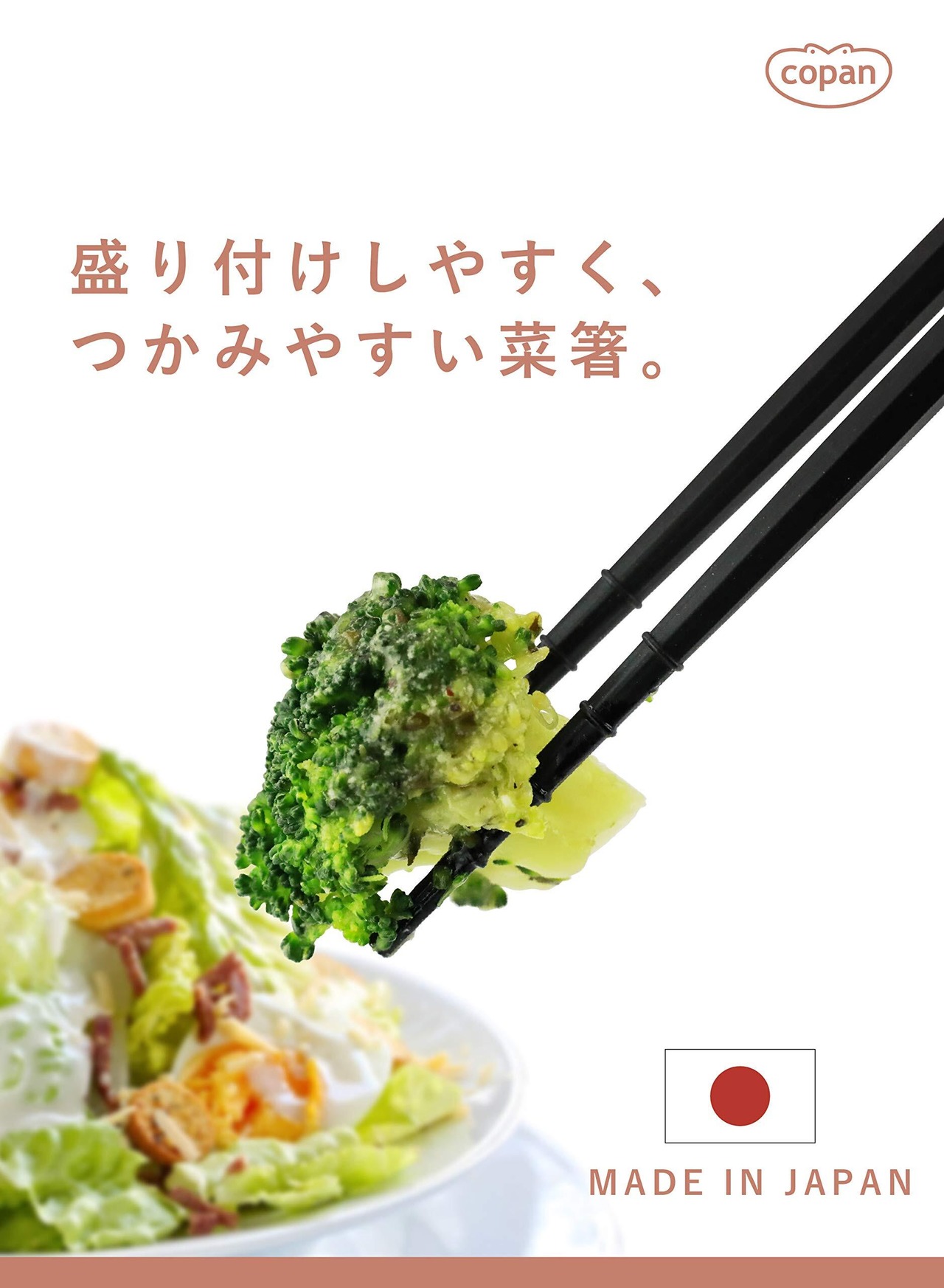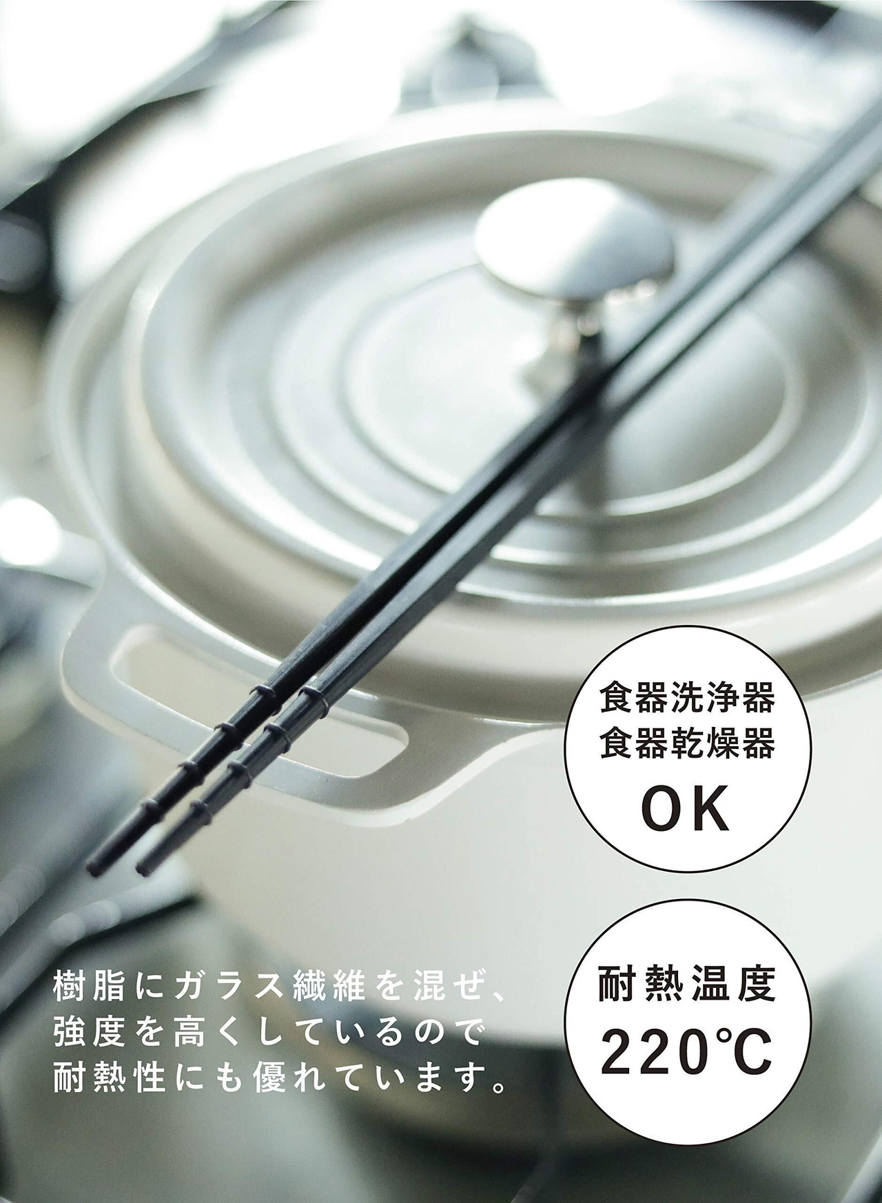 盛り付けしやすく、つかみやすい抗菌菜箸。樹脂にガラス繊維を混ぜ、強度を高くしているので、耐熱性にも優れています。※耐熱温度:220度