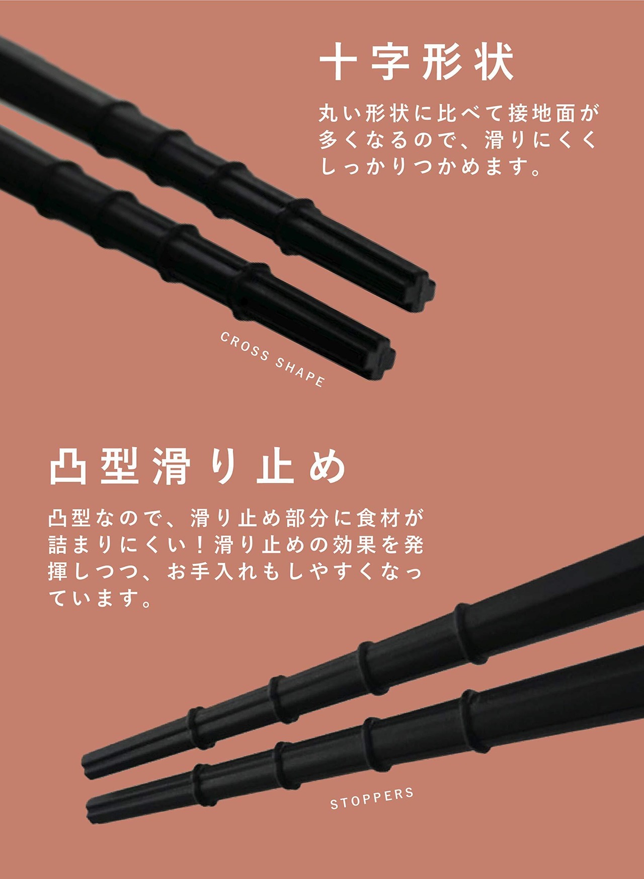 十字形状の箸先と凸型滑り止めで食材をしっかり掴めるので、盛り付けや調理、取り箸など、さまざまなシーンで活躍します。