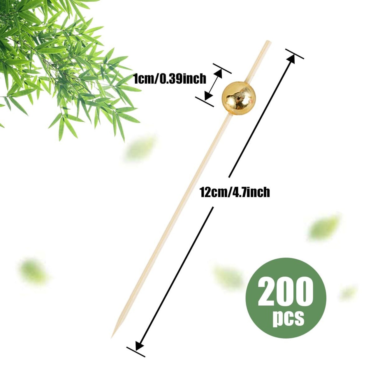 【カクテルピック】おしゃれなゴールドビーズが飾るカクテルピックです。シンプルで実用的なデザインで、食べ物の盛り付けにファッション感を加えることができます。 【高品質の素材】竹製フルーツピックは滑らかでバリがなく、握りやすく、快適な使用感をもたらします。先端が鋭くて使いやすいです。 【サイズ】全長約12cm。ちょうどいいサイズで、カクテル、ドリンク、フルーツ、野菜、前菜ピック、デザートなどに最適です。ミニ串を作ることもできます。 【適用場合】日常的に使用したり、パーティに供給したりするのに十分です。誕生日、結婚式、クリスマス、パーティー、バーベキュー、バーなどに欠かせないアイテムです。 【パッケージ】カクテルピック190本セット。