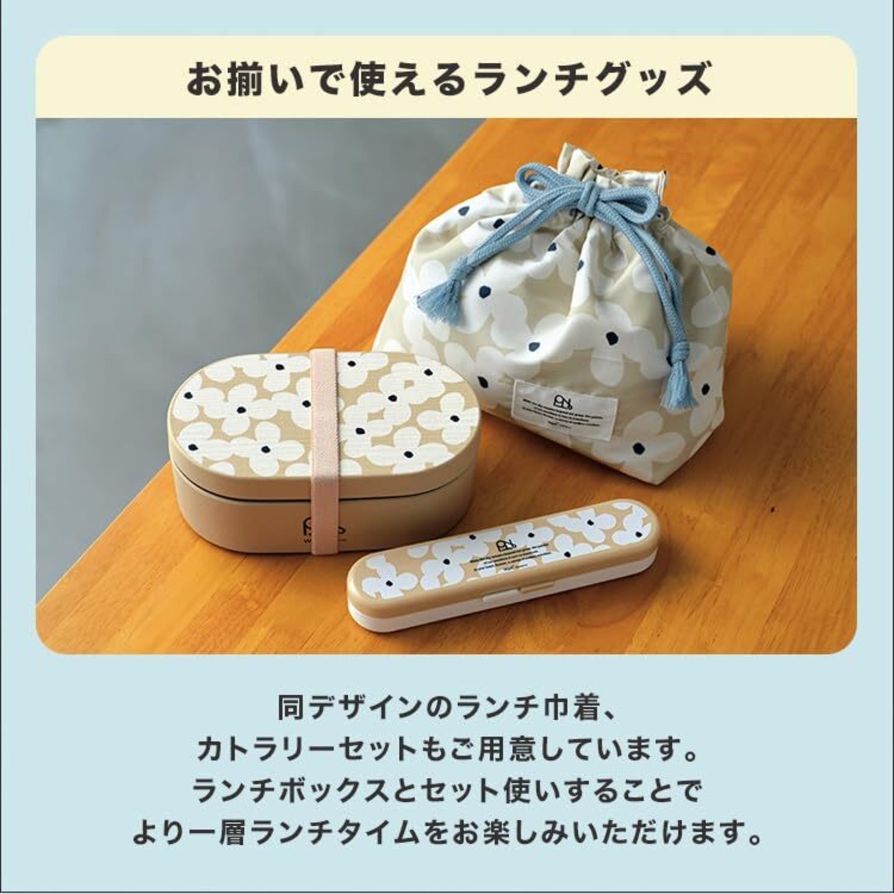 ランチボックスやランチ巾着と同様のデザイン展開なので、お揃いでお使いいただけます。