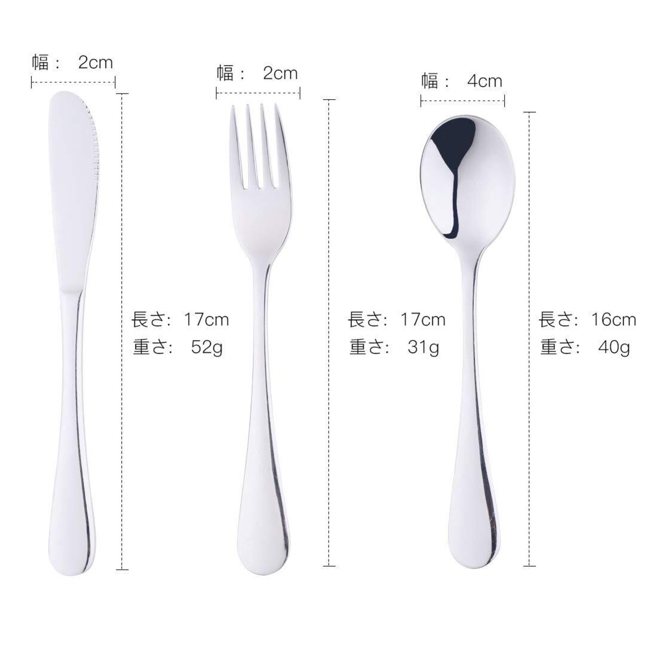 【基本情報】素材:18-8ステンレス鋼 サイズ:ナイフ:長さ 17cm 最大幅 24cm 重さ 約52g フォーク:長さ 17cm 最大幅 2cm 重さ 約31g スプーン:長さ 16cm 最大幅 4cm 重さ 約40g
