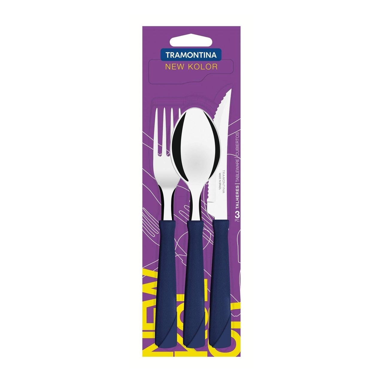 トラモンティーナ ステーキナイフ20cm&テーブルフォーク18cm&テーブルスプーン18cm ニューカラー 3本セット 青 食洗機対応 軽量 ブラジル製 23199/169 TRAMONTINA