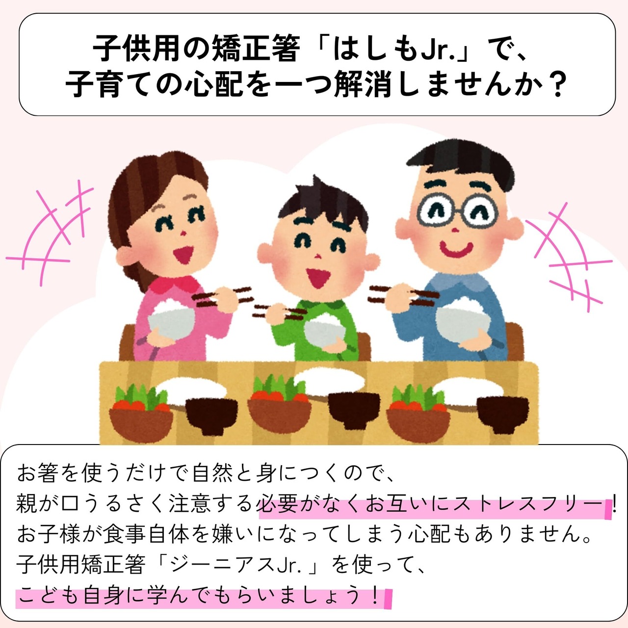 仕様 品名:はしもJr.(子供用矯正箸) 材質:天然木 塗装:ポリエステル塗装 産地:日本 サイズ:右利き用 18cm, 16.5cm, 15cm, 14cm / 左利き用 18cm, 16.5cm 内容:箸1膳 お手入れ:手洗い推奨 注意事項:右利きと左利きの箸があります。適切なものを選んでください。 「はしもJr.」は、子供たちが正しいお箸の持ち方を楽しく身につけられるよう設計されています。子供の成長に合わせて選べるサイズと、左利きの子供たちも忘れずに配慮された設計は、すべての子供が快適に練習できる環境を提供します。