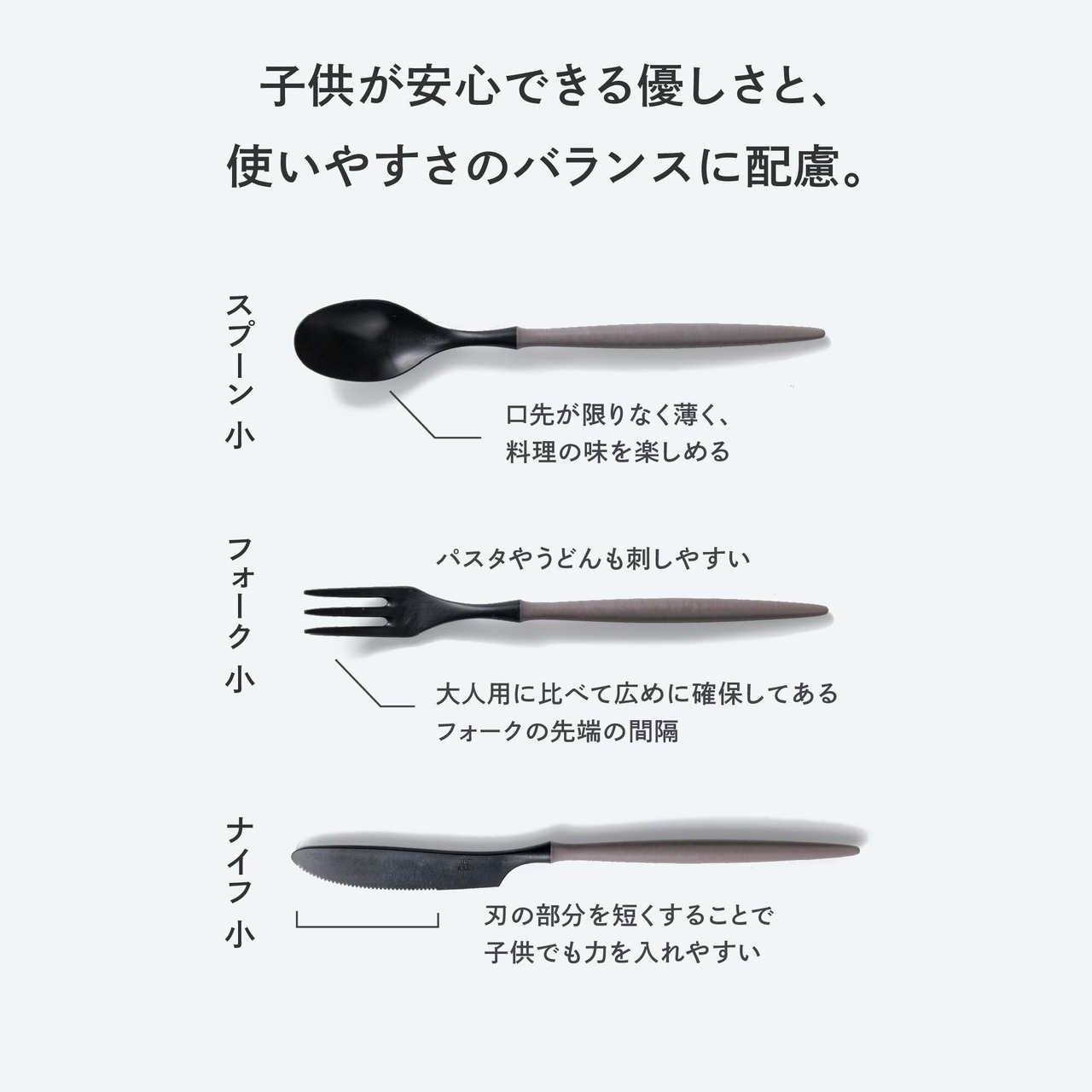 【こだわりある人の普段使い食器】キッズフォークの付け根は汚れが溜まりにくいザグリ形状で、お手入れも簡単です。小さいサイズは子供も使いやすく、デザートやフルーツを食べる際にもおすすめです。