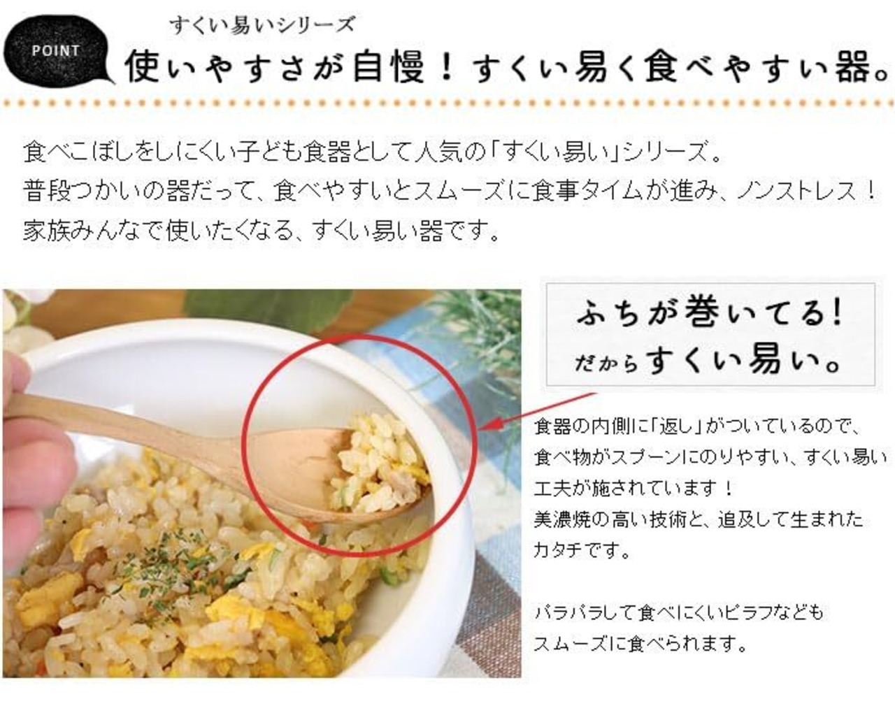 【食事を楽しく美味しく!】小さなお子様が一人でも食べやすいように開発されたのが、“すくい易いシリーズ”渕が内側に丸まっているので、スプーンがひっかかり、上手におかずをすくうことができます。