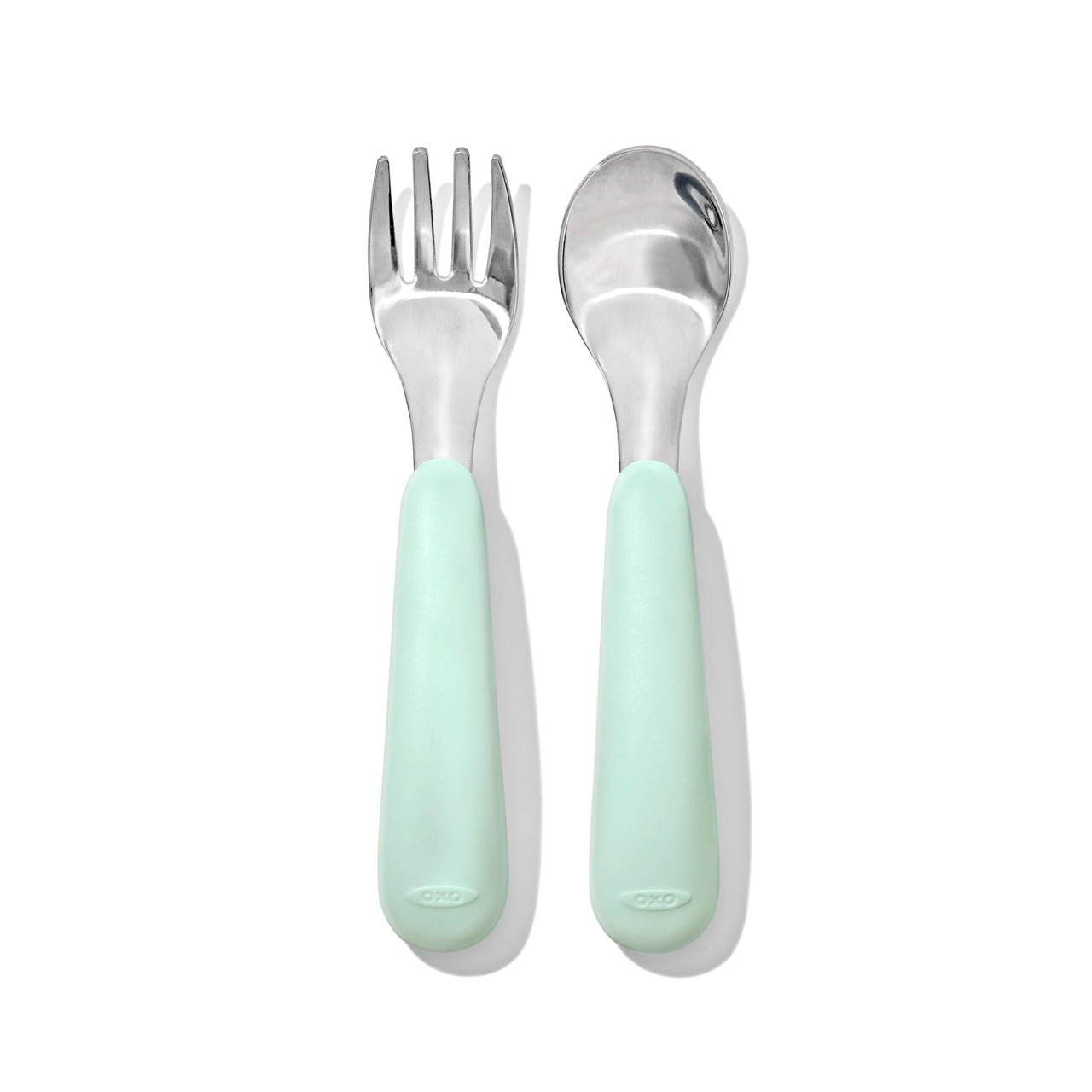 丈夫なステンレス製のフォークとスプーンは大人用の食器を使う前の練習にぴったり