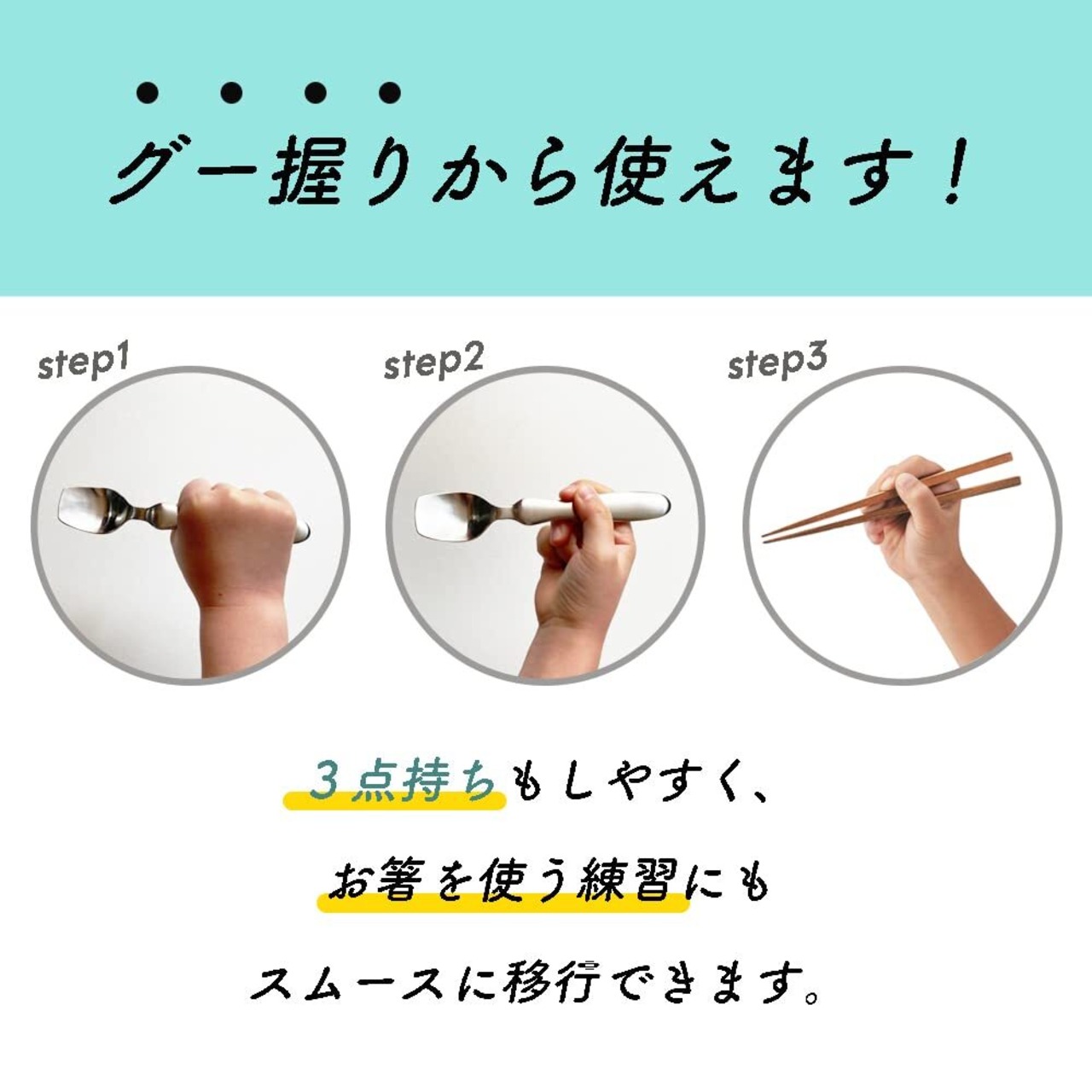 自分でしっかり握れて食べられる持ち手ふっくらタイプのスプーンです。オールステンレスなのでまるごとつるっと洗えて衛生的。食器洗い機対応なので洗い物もラクチンです。三点持ちしやすい設計で、箸への移行もスムーズに!