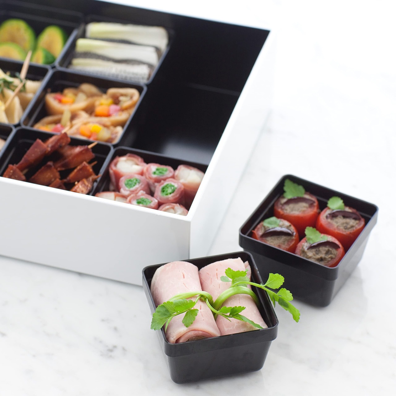 DEAN & DELUCA 三段重大 ホワイト シンプルな白のお重にDEAN & DELUCAのシルバーロゴが入った三段重です。 1段目と2段目には様々な料理が詰められるように仕切りがついています。 素材:本体・蓋:ABS樹脂、シール蓋:ポリエチレン樹脂 縦19.5X横19.5X高さ16.5cm 重量:1360g 日本製