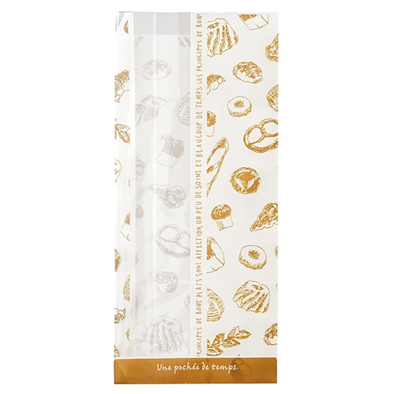白地にパンの手描きイラストをあしらったあたたかみのある食品対応の紙袋(耐油)です。食品をより美しくおいしそうに見せてくれる窓がついています。耐油紙を使用しているのでパンやお菓子などを直接入れてお使いいただけます。
