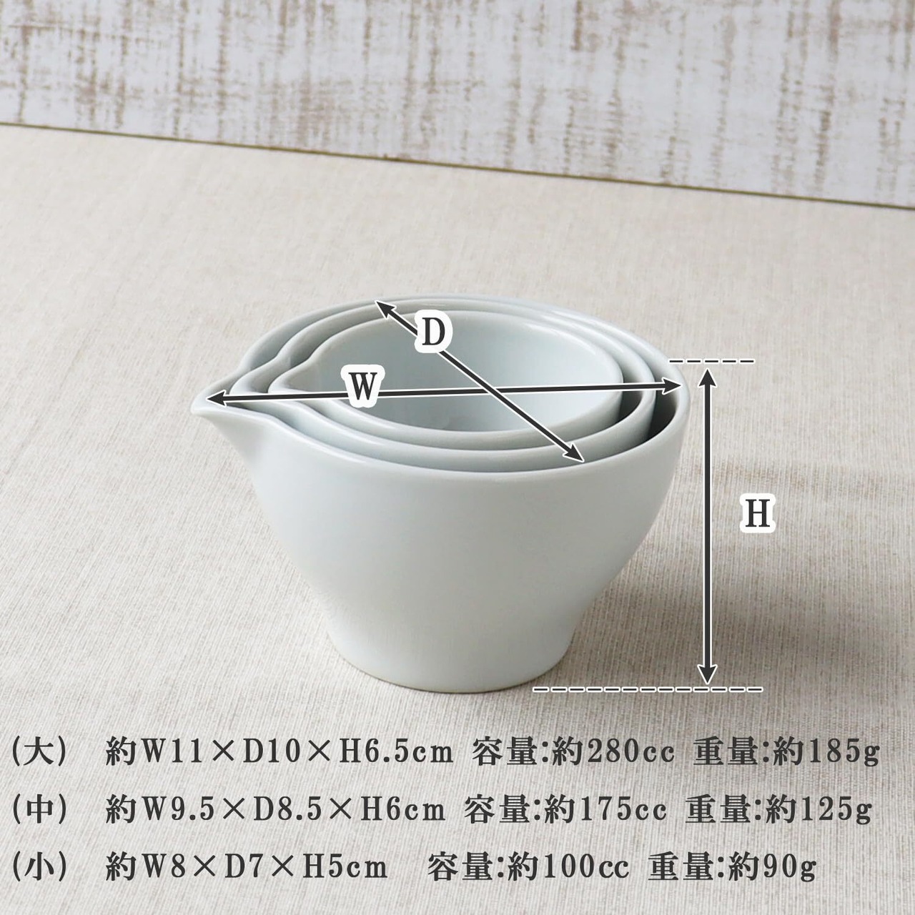 【商品詳細】サイズ:大:約幅11×奥行10高さ6.5cm 中:約幅9.5×奥行8.5高さ6cm 小:約幅8×奥行7高さ5cm/容量:大:約280㏄(満水時) 中:約175㏄(満水時) 小:約100㏄(満水時)/重量:大:約185g 中:約125g 小:約90g