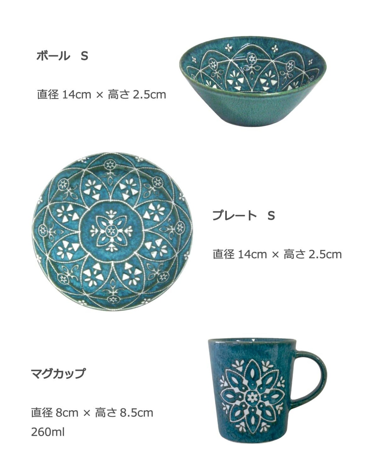 サイズ:プレートL ー直径24cm×高4cm、カレーパスタ皿ー直径20.5cm×高4cm、ボールS ー直径14cm×高2.5cm、プレートSー直径14cm×高2.5cm、マグカップ ー直径8cm×高8.5cm 容量260ml
