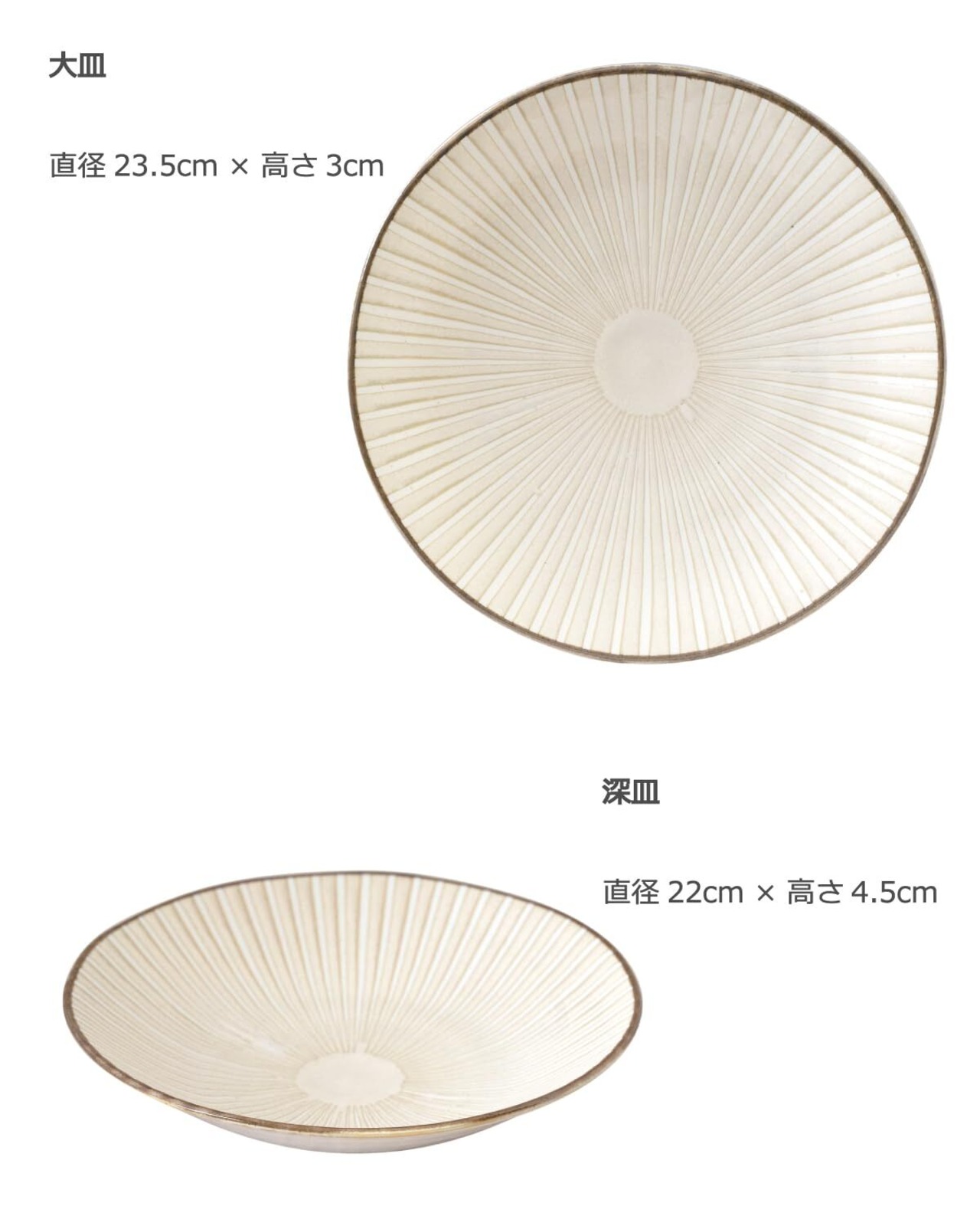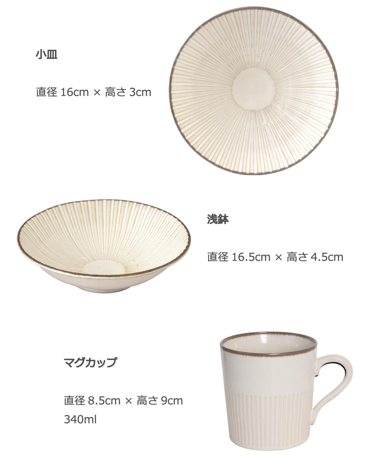 サイズ:大皿 ー直径23.5cm×高3cm、小皿ー直径16cm×高3cm、深皿 ー直径22cm×高4.5cm、浅鉢 ー直径16.5cm×高4.5cm、マグカップ ー直径8.5cm×高9cm 容量340ml