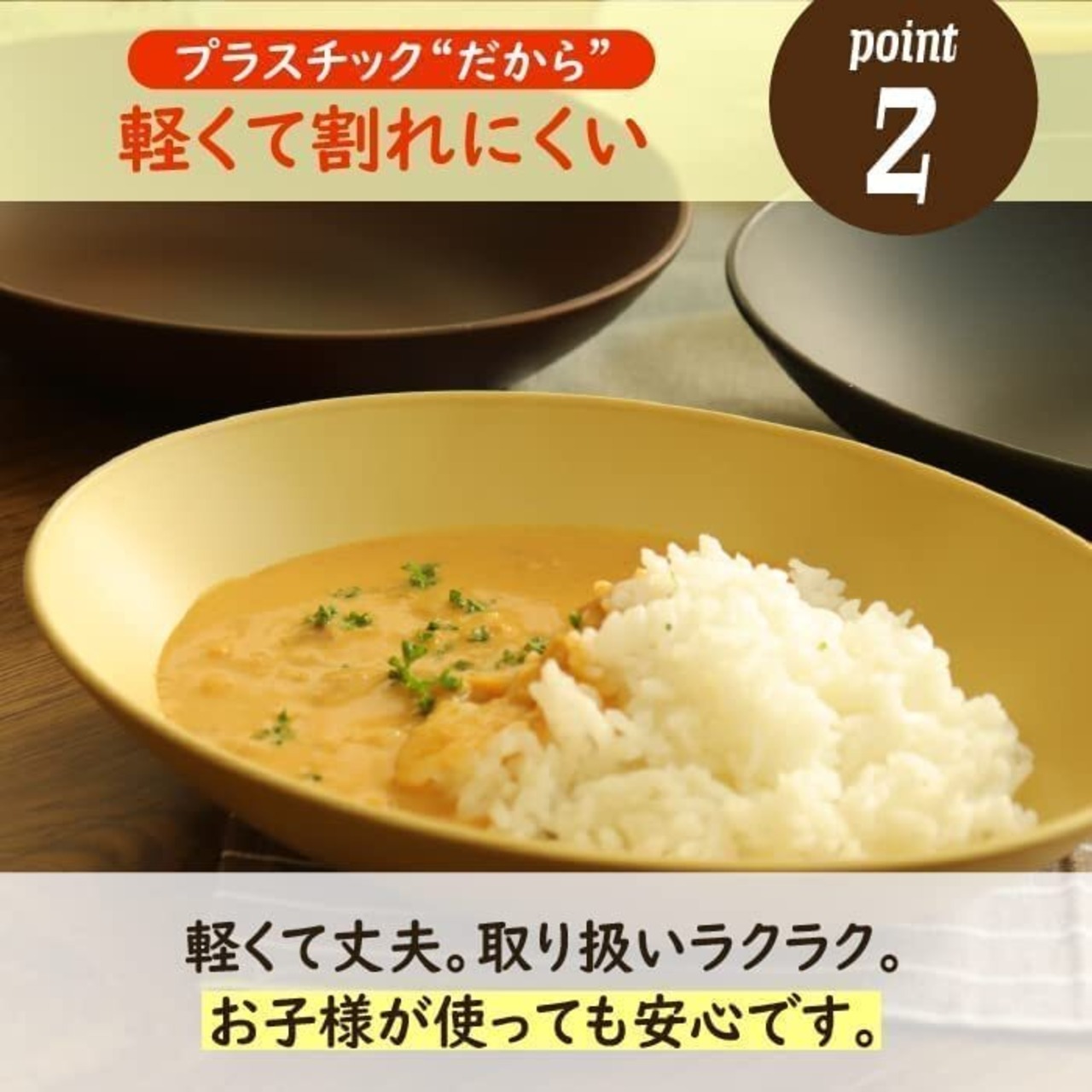 【軽い&割れにくい】非常に軽く、落としても割れにくいプラスチック食器です。どなたにも安心してお使いいただけます。業務用としても「レストラン」「保育園」「介護施設」など、幅広くご採用いただいています。