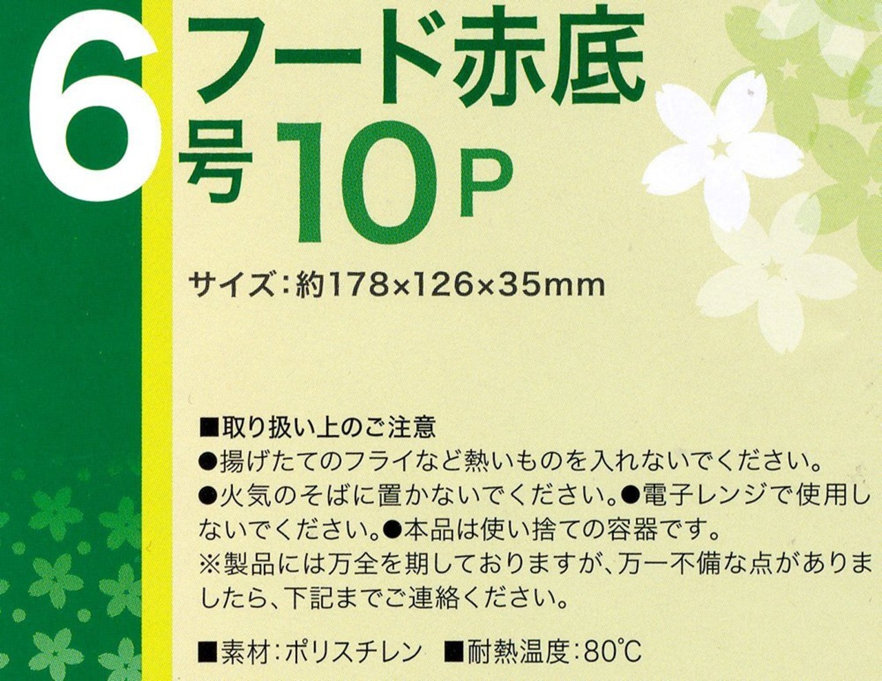 使用上の注意:1 電子レンジ、オーブンでの加熱はできません。2 食物の簡易的な保存容器です。ご使用目的以外のご使用はできません。3 使い捨ての容器のため、使いまわしはできません。4 揚げたてのから揚げや天ぷらを容器に入れると本体がとけるおそれがありますので、一旦さましてから入れてください。