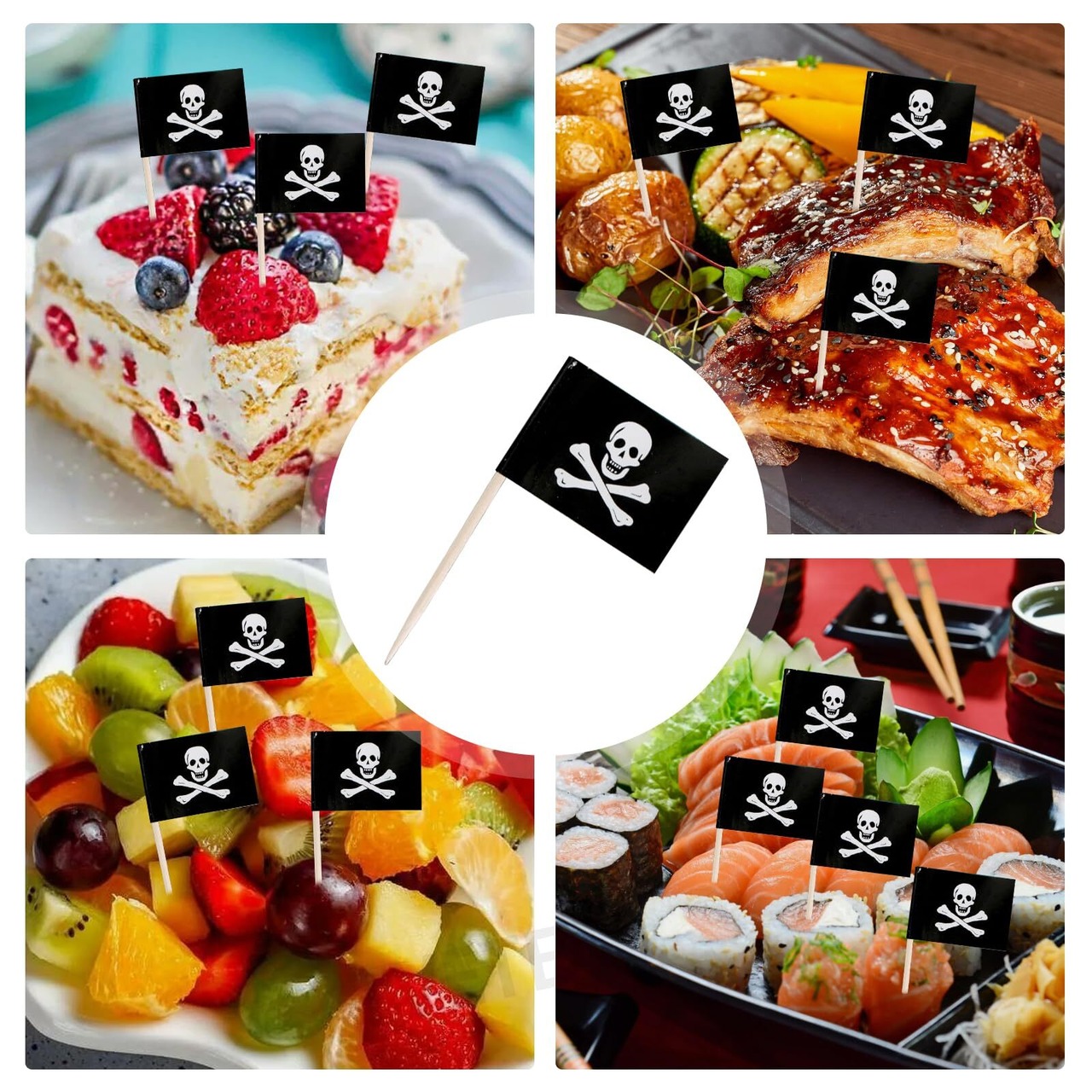 【海賊をテーマにした食器と合わせる】: 海賊旗のつまようじ飾りを、海賊船の形をした皿やドクロの模様のカップなど、他の海賊をテーマにした食器と合わせて、海賊をテーマにしたテーブルセッティングを完成させましょう。ダイニングテーブルの上、ケーキの横、またはドリンクの中に置くと、シーン全体がすぐに冒険と楽しさで満たされます。