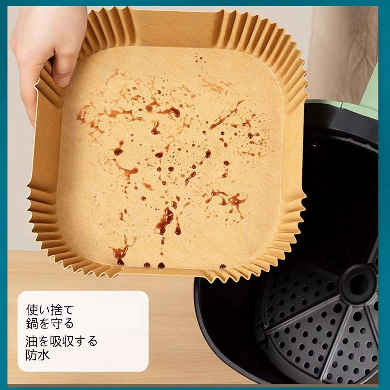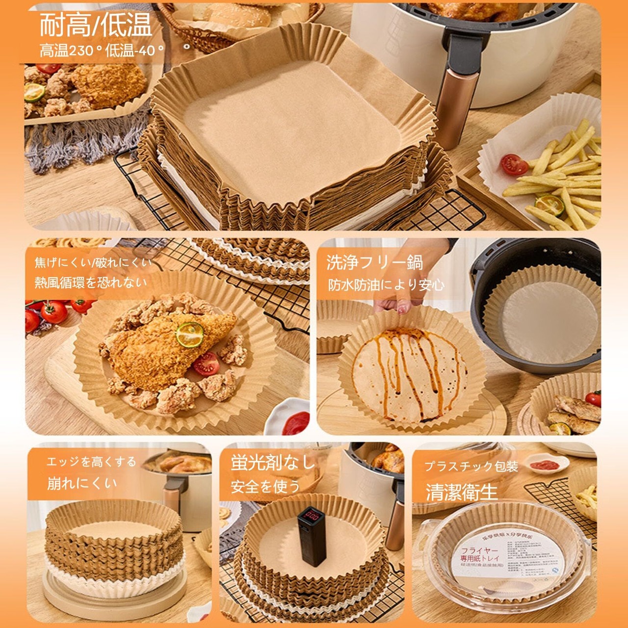 エアフライヤーペーパーは食品が直接フライヤーに触れるのを防ぎ、食べ物の残りかすや油汚れをフライヤーから遠ざけます。これによりフライヤーを清潔に保ち、清掃時間も短縮できます。使用後はエアフライヤーを簡単に洗うだけです。一人で作業しても素早くできます。使い捨てなので、使用後はそのままゴミの分別に従って処理することができます。