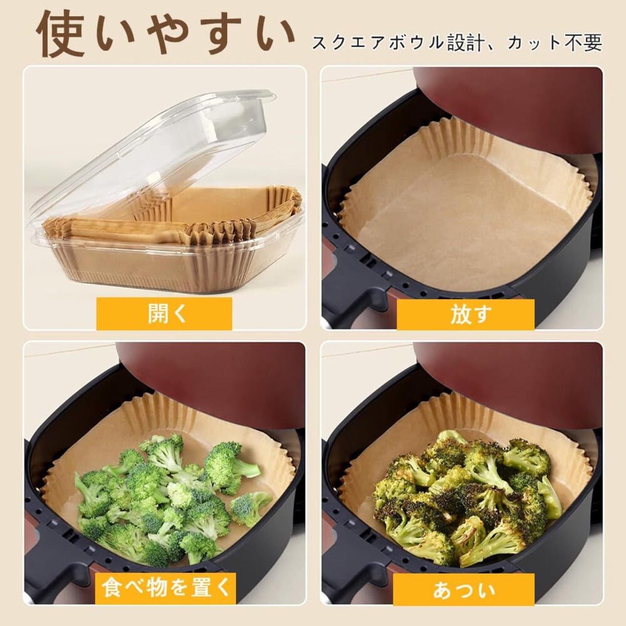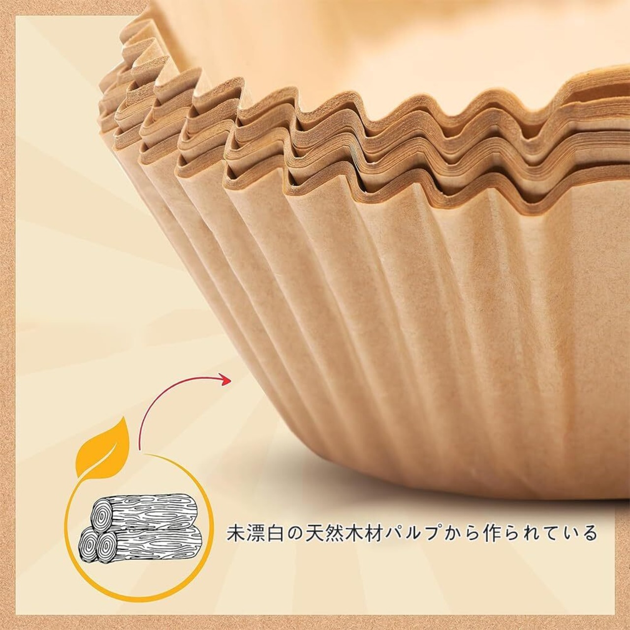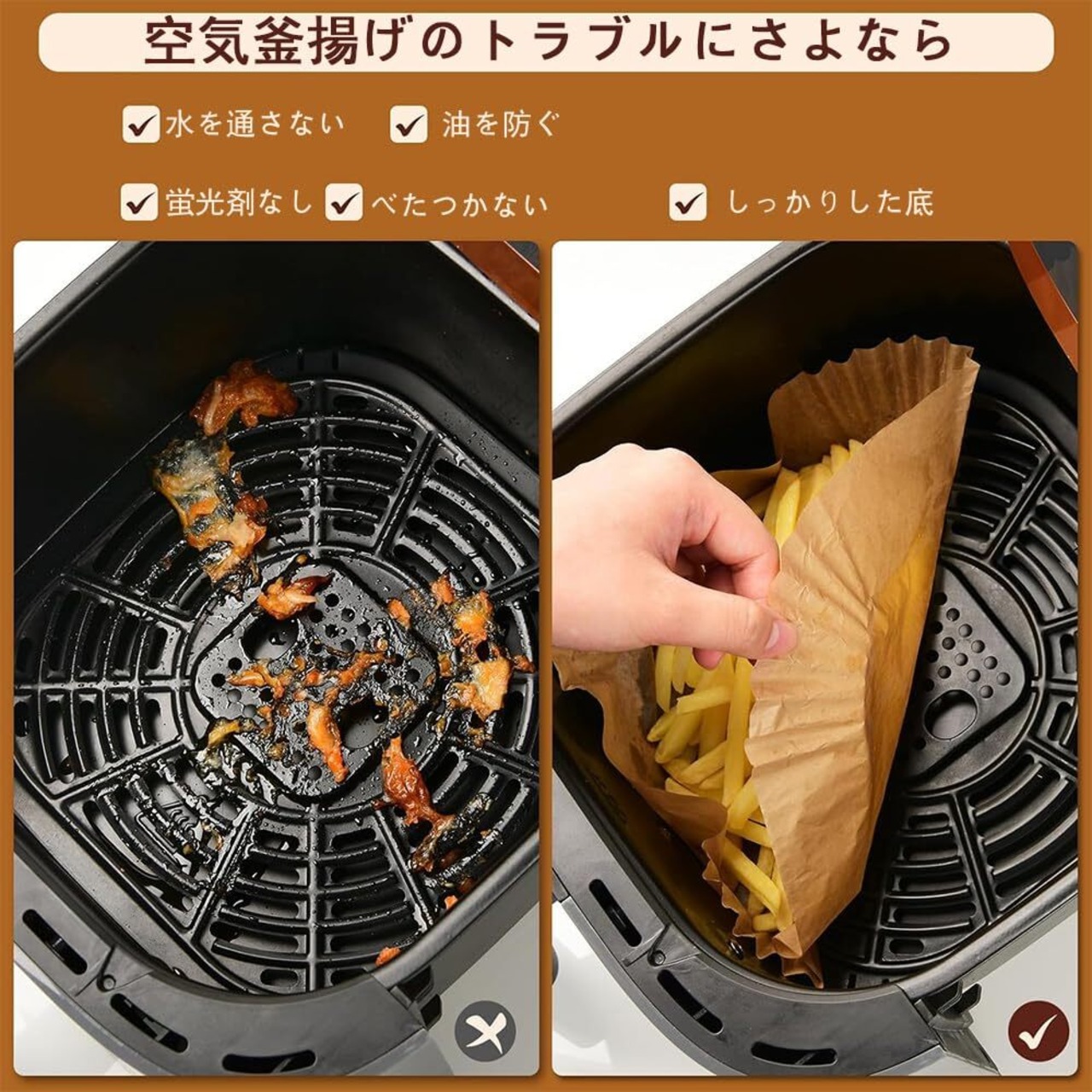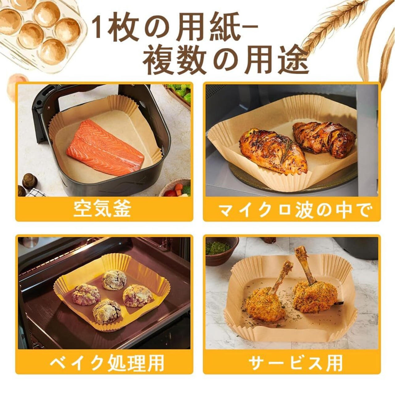 【多機能性】このエアフライヤー用紙は、エアフライヤーやオーブン、電子レンジ、蒸し器など、さまざまな調理器具に対応しています。使い勝手がよく、多目的に使用できるので、料理の準備や片付けを簡単にします。