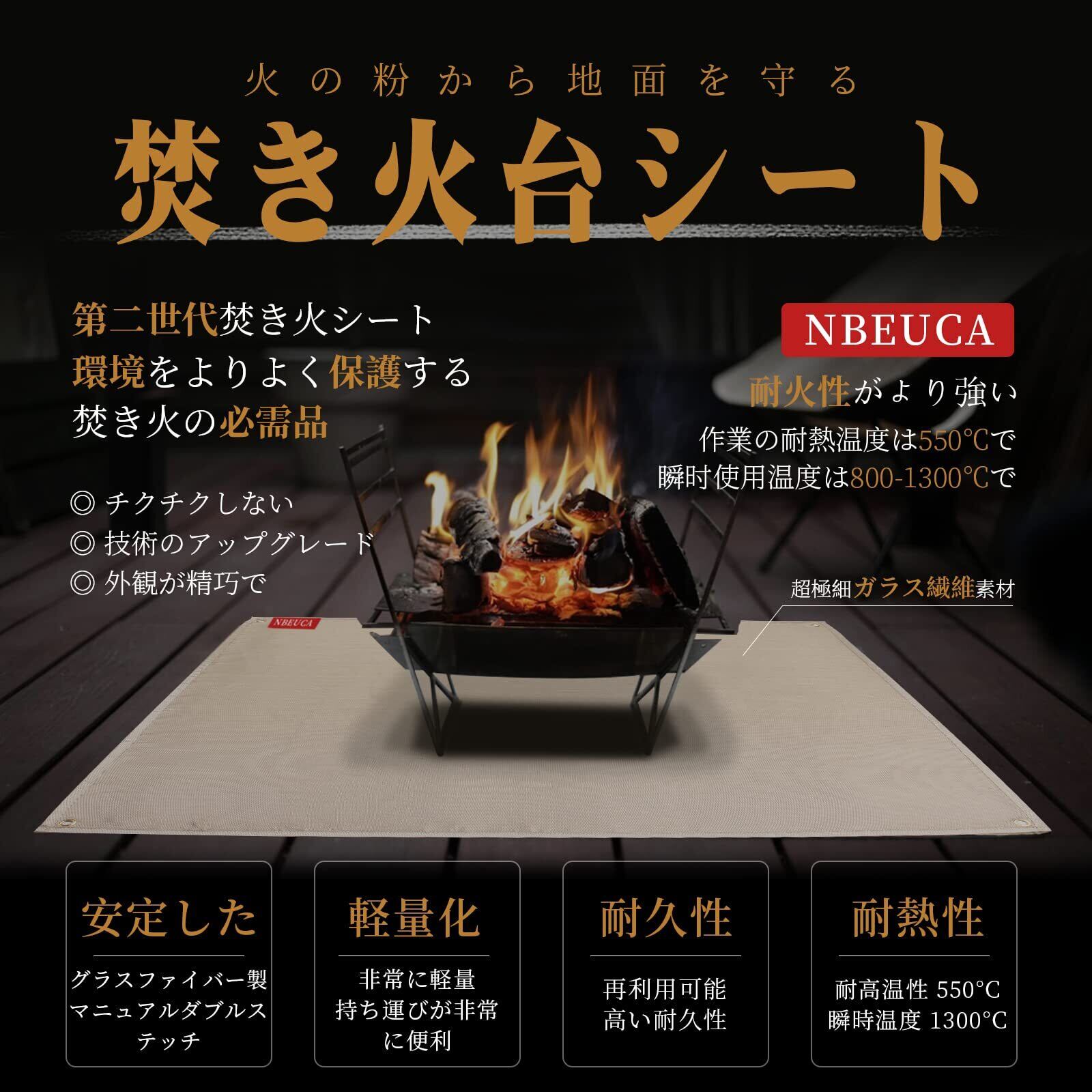 【耐火性がより強い】たきび台シートは直径がより細い8umガラス繊維採用し,難燃性と空気密度は普通の焚き火台シート高く、作業の耐熱温度は550℃で、瞬間使用温度は800-1300℃に達します。