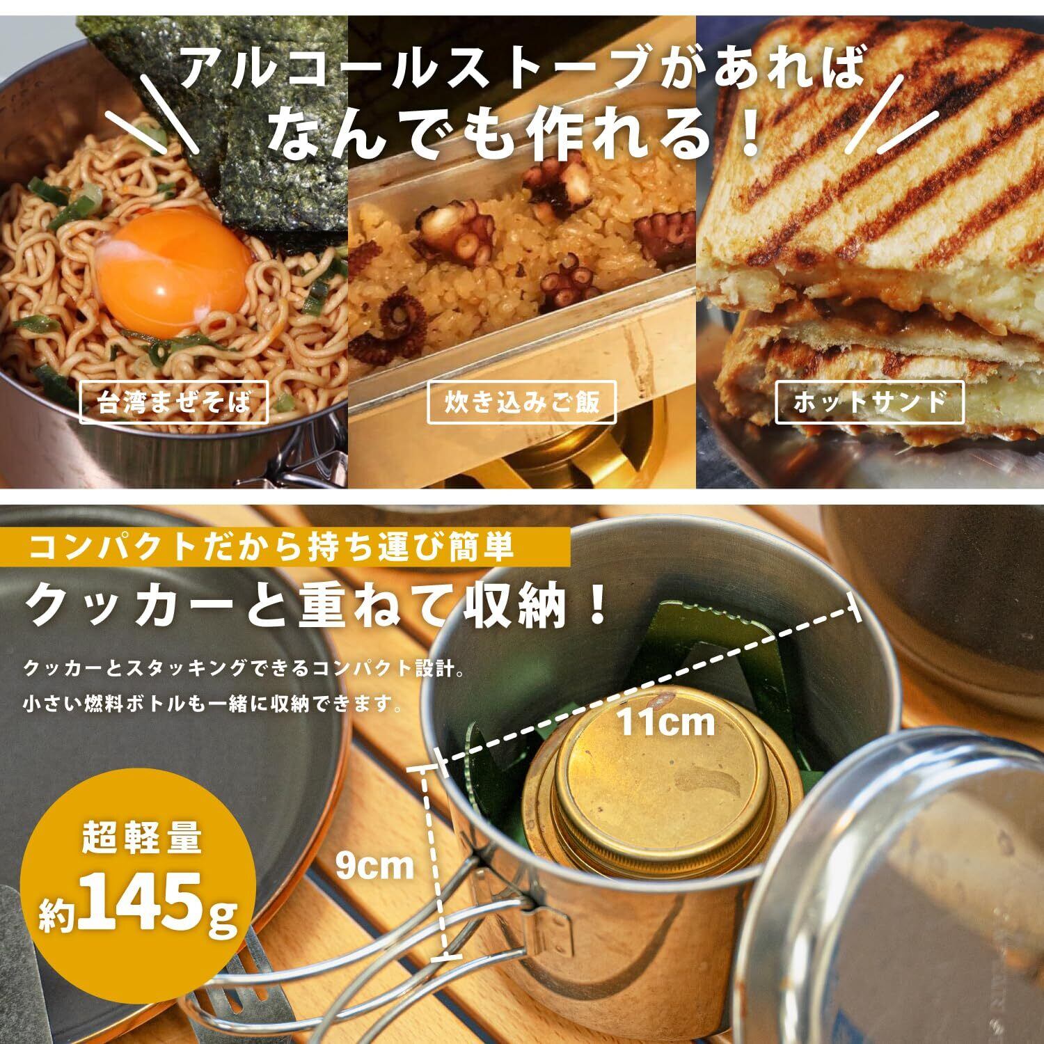 <シーンを選ばない>アルコールストーブと五徳の重量を合わせても147gととても軽量なので、 荷物を小さく軽くしたいソロキャンプ登山ツーリングなどの様々なアウトドアに最適です。また別売りのウインドスクリーン風防などと合わせてお使いいただくととても良いです。