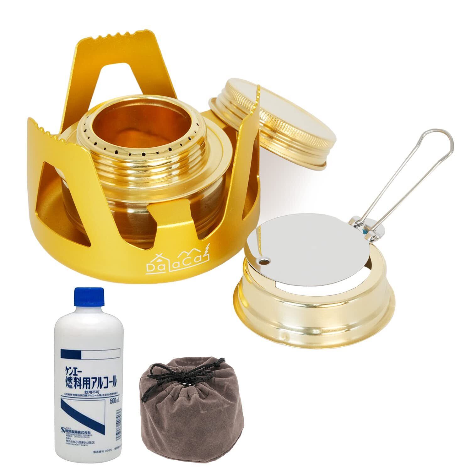 【新春セール】DaLaCa アルコール ストーブ バーナー キャンプ 登山 アウトドア 用品 軽量 11cm×7cm145g 五徳 アルコール 収納袋付き 選べる6色! (燃料付き, ゴールド)