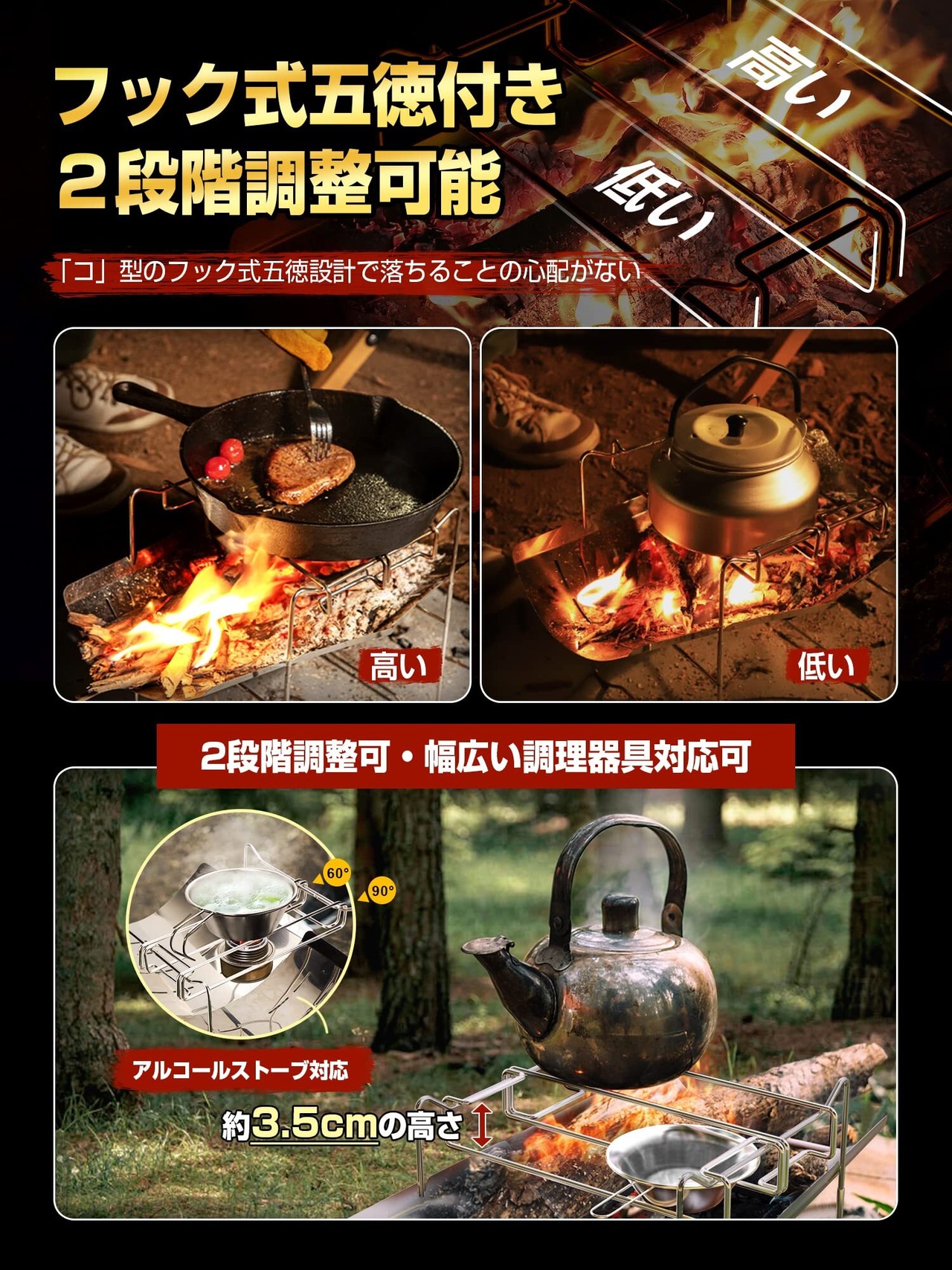 取り外し可能なフック式五徳が付属しており、鍋やクッカーをしっかり支えます。煮炊きや炒め物、焼き物など多様な料理に対応でき、アウトドアクッキングの幅を広げます。これ一台で、皆さんのキャンプ料理が楽しめることでしょう。