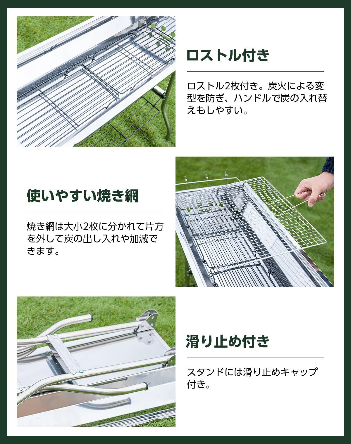【6〜8人用の広々焼き面|スタンド式で快適調理】焼き面はワイドな73.5×33.5cmサイズ。グループBBQや家族イベントにも余裕の調理スペースで、肉も野菜も一気に焼けます。スタンドは折りたたみ式で、組み立て不要。安定感のある脚部で屋外調理を快適にサポートします。BBQ初心者や女性にも扱いやすい設計です。