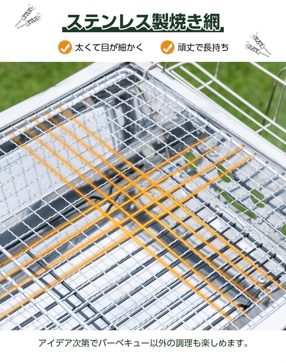 ️【頑丈ステンレス製|2枚焼き網で炭の出し入れもスムーズ】本体は錆びにくく腐食にも強い高品質ステンレス素材を採用。耐久性に優れ、屋外での使用にも安心です。左右の通気口設計により燃焼効率をアップし、火起こしもスムーズ。大小2枚の焼き網が付属し、調理しながら炭の追加や調整が簡単に行えるのも嬉しいポイント。