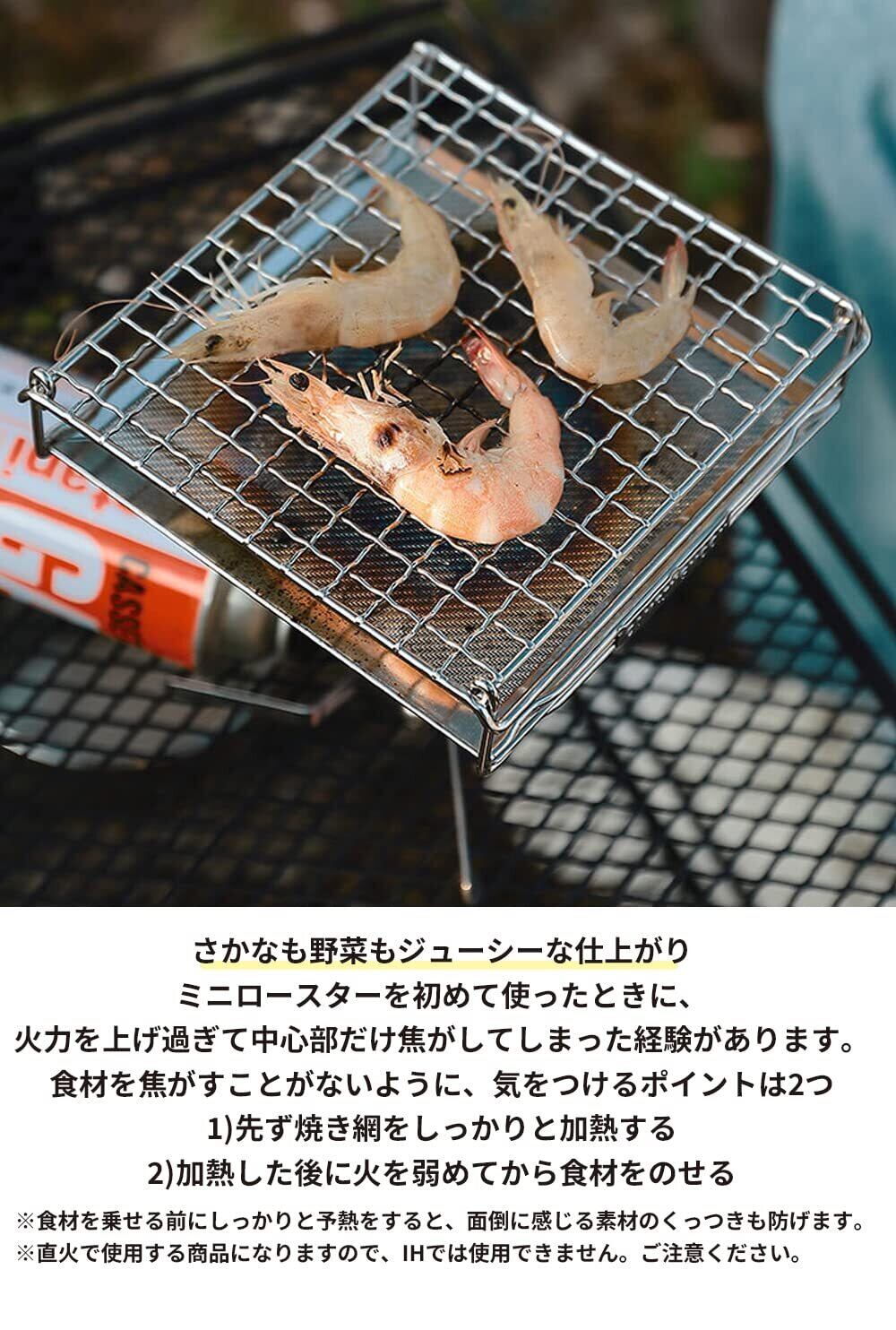 この「キャンピングムーン ミニロースター」は、特にキャンプやアウトドアに最適なアイテムです。高品質なハイメッシュ素材を使用したメッシュデザインにより、食材の風味を損なうことなく、均一に熱を通すことができます。コンパクトサイズのため、持ち運びも便利で、あなたのアウトドアライフをより豊かにします。
