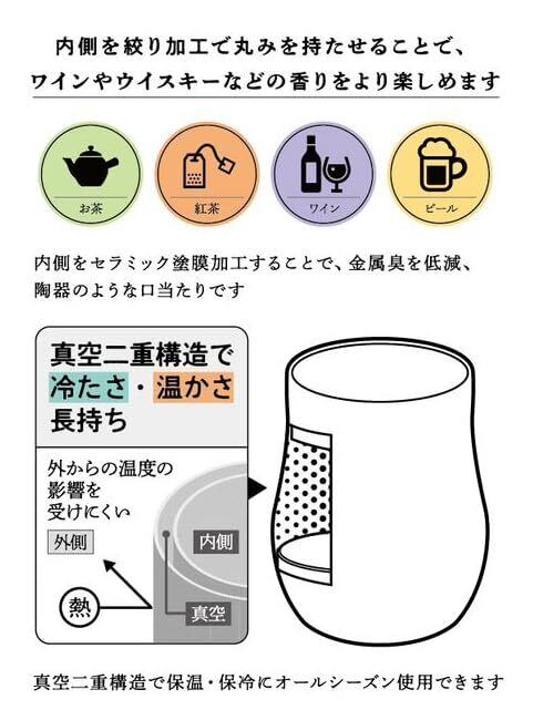 このタンブラーは、真空二重構造により飲み物の温度を長時間保持します。温かいコーヒーや冷たいビールを楽しむ際に、最適な温度を維持し、利便性を高めます。また、表面が結露しないため、持ちやすく、安心して使用できます。