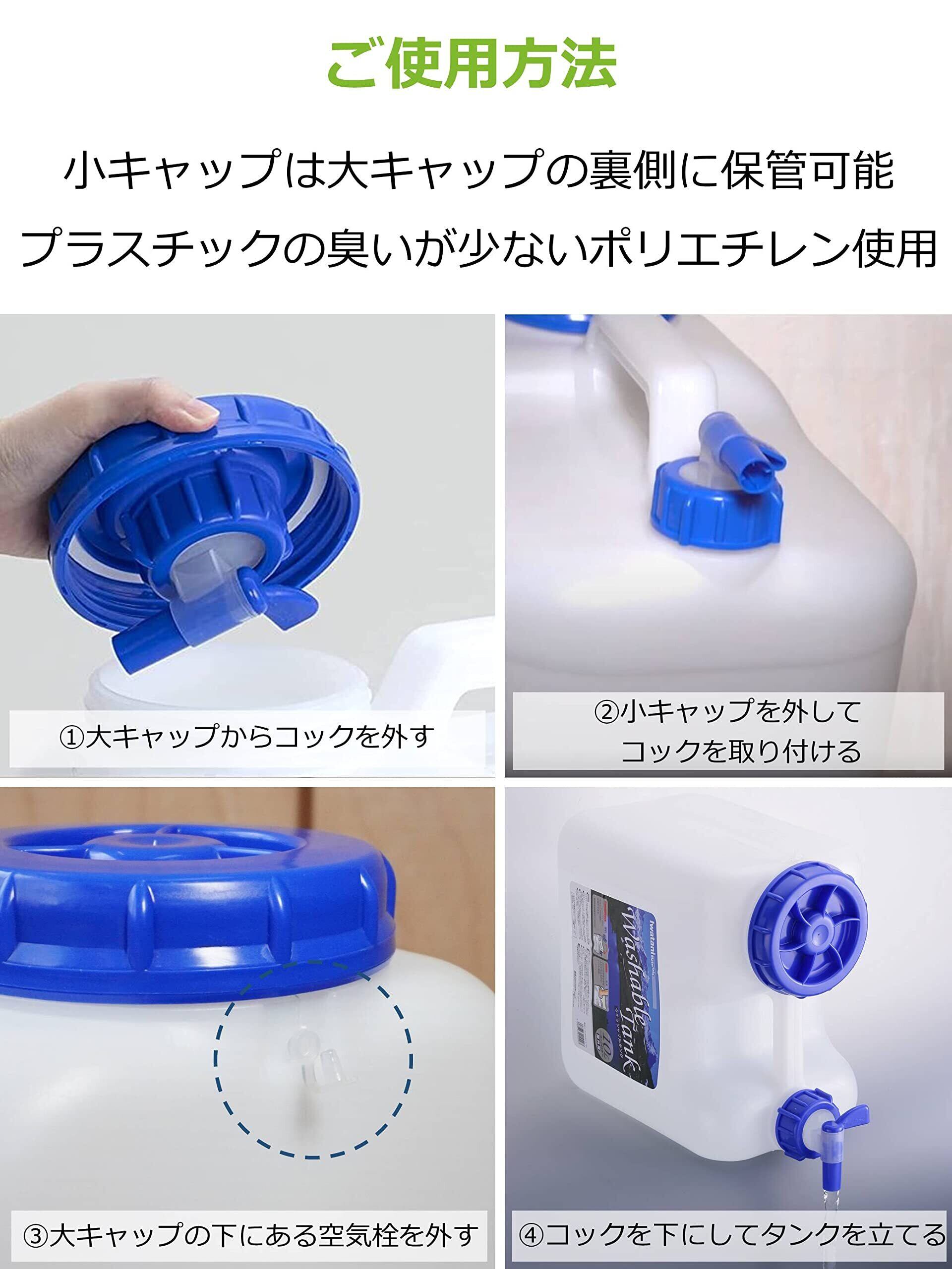 このタンクはウォッシャブル設計のため、清潔に保つことができ、お手入れも簡単です。キャンプやバーベキューの後もすぐに洗っておけるので、衛生面でも安心です。どんな場面でも手軽に水を確保し、快適に過ごせるアイテムです。