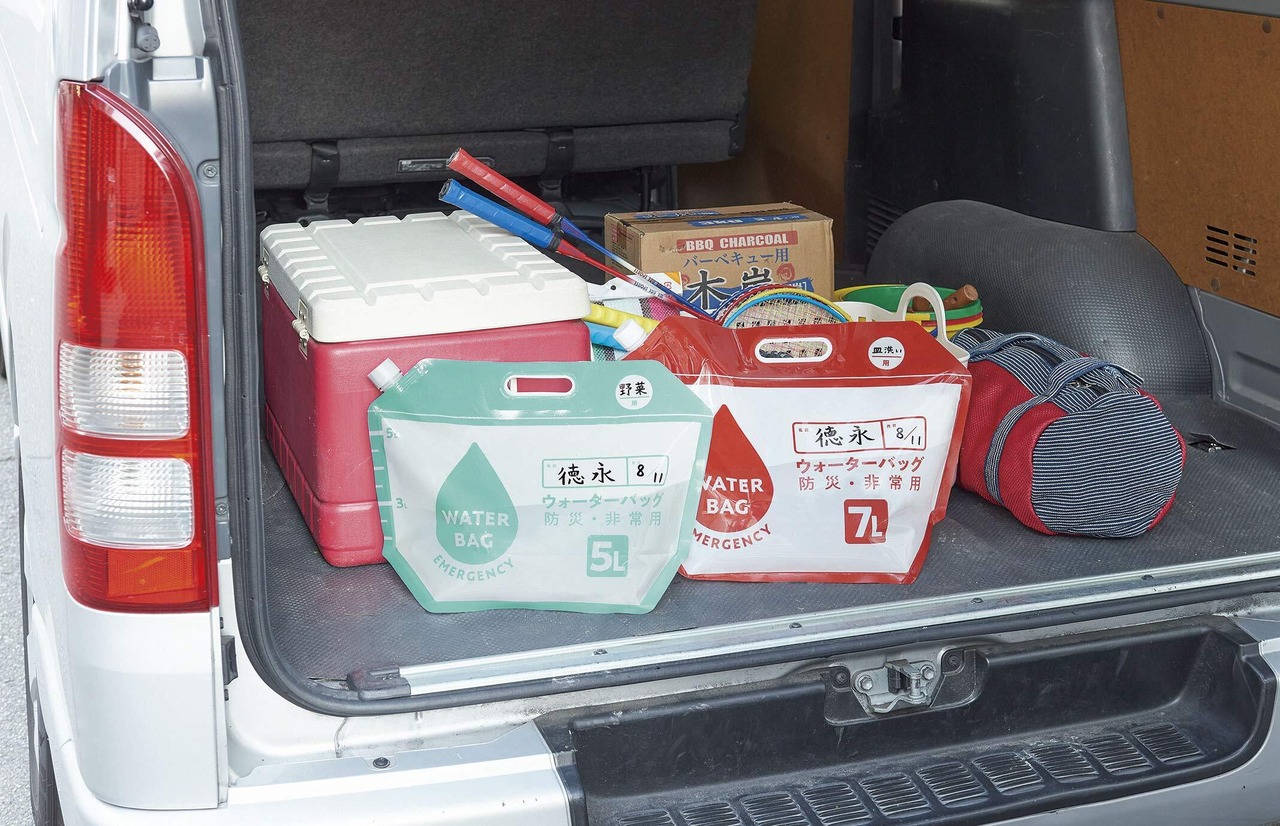 災害時や断水など非常時に小さく折りたたんでコンパクトにどこでも入れられる。