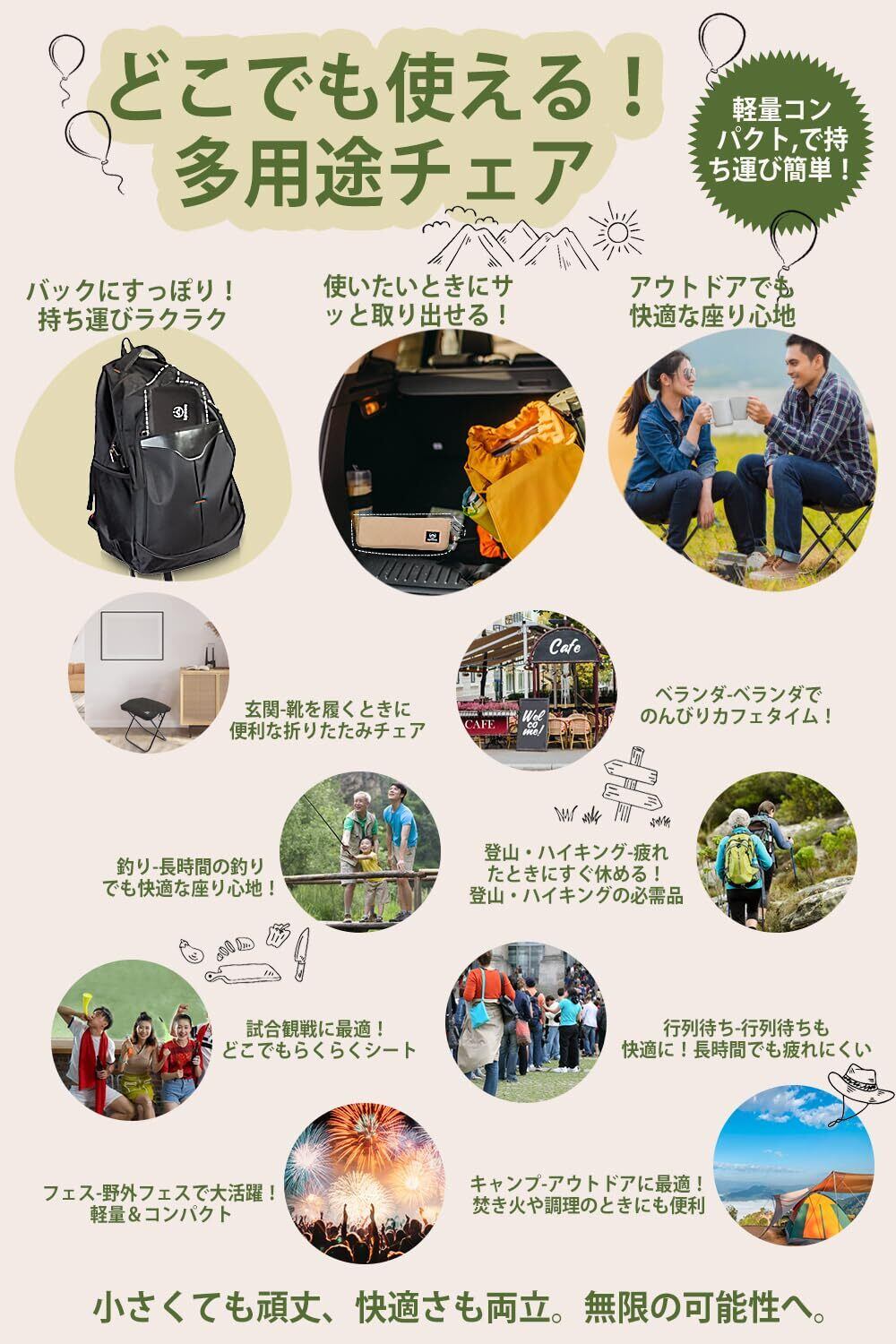 【多用途で活躍|釣り、登山、フェス、運動会にも最適】 キャンプはもちろん、釣り、登山、運動会、スポーツ観戦、公園ピクニックなど、あらゆる屋外シーンで大活躍。耐摩耗性にも優れており、長く使えるアウトドアチェア。車中泊や非常用としても◎。