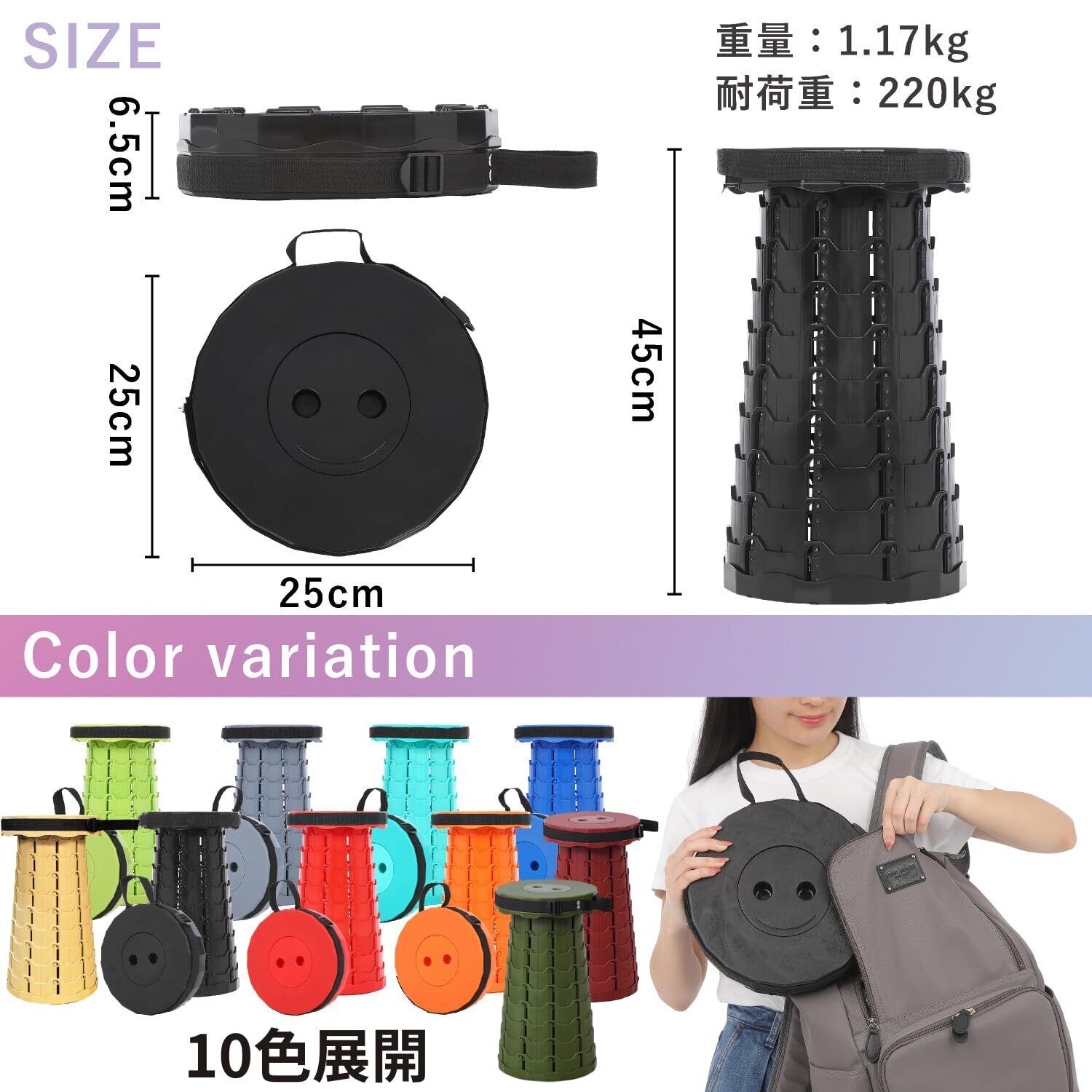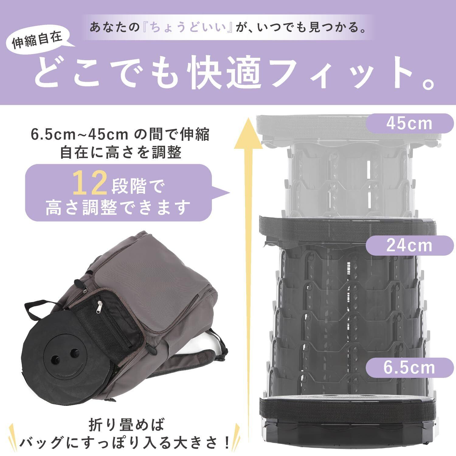 【どこでも快適フィット】1秒で開閉可能は折り畳みイスです。6.5cm〜45cmの間まで12段階で伸縮自在に高さ調整することができます。折り畳めばバッグにも収納することができます。