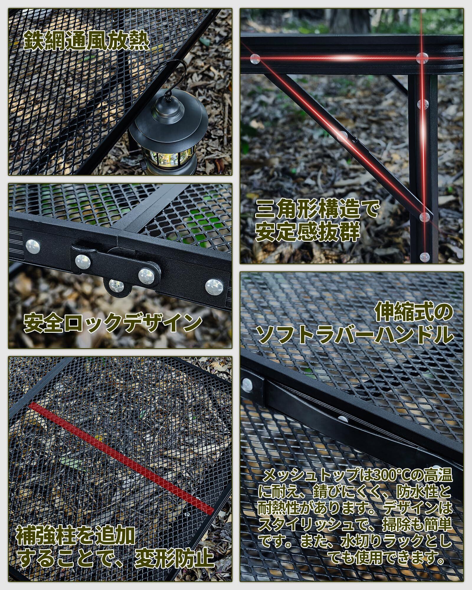 【多機能テーブル】:【焚き火テーブル】DesertFox延長テーブルは鉄網設計で、耐熱コーティングが施されており、高温の調理器具を置くことができます。耐熱温度は300度に達しているため、篝火テーブルとしても使用可能です。DesertFoxの焚き火台と一緒に使用でき、火花の問題も心配ありません。◆【水切り台 】漏水設計で、防錆・防汚加工が施さ1台多役れており、拭くだけで簡単にお手入れできます。水切り台としても使用できます。◆【アウトドア調理台】両側に拡張スペースがあり、使用面積を増やすことができます。キャンプランプ、水筒、シラーズボウル 、S字フックを置け、料理中には調味料を置くことができ、休息時には収納でき、スペースを節約できます。さらに、ダイニングテーブルや作業台、子供の工作テーブルとしても使用できます。部屋全体のスタイルとランクを向上させます。2つ以上の購入が可能で、さまざまな配置方法に対応しています。並べたり、L字型にしたり、直線的に配置することができ、異なる使用シーンに対応します。