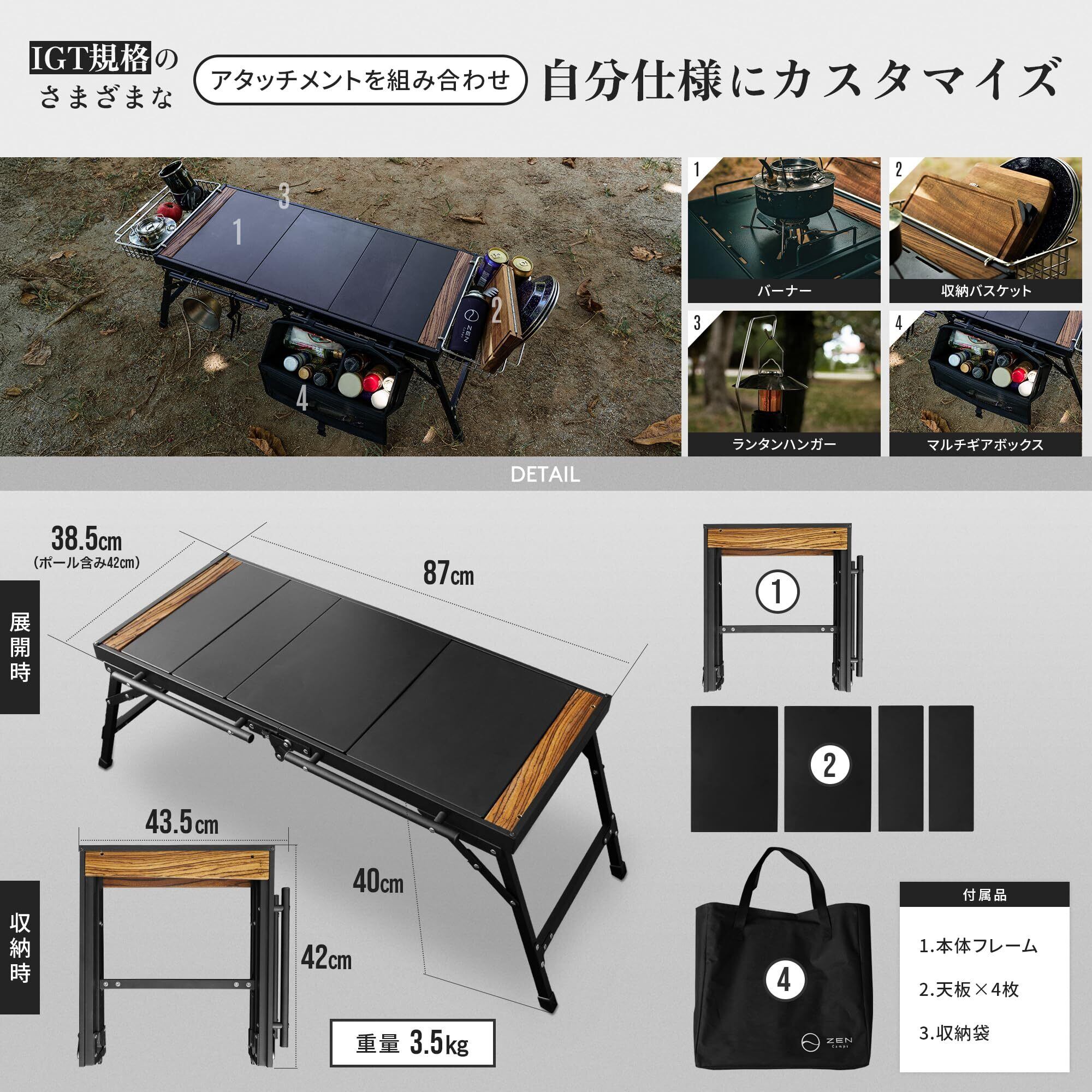 【様々なカスタマイズが可能】igt互換のサイズで製作しているため、様々なパーツを使ってカスタマイズを楽しめます(バーナー/バスケット/ランタンハンガー/コンロなど)。ZENCampsからも両サイドに設置できるバスケットをオプションで販売中。調理器具や食器、細かいギアもカゴに入れて整理でき、テーブルから落ちる心配もありません。