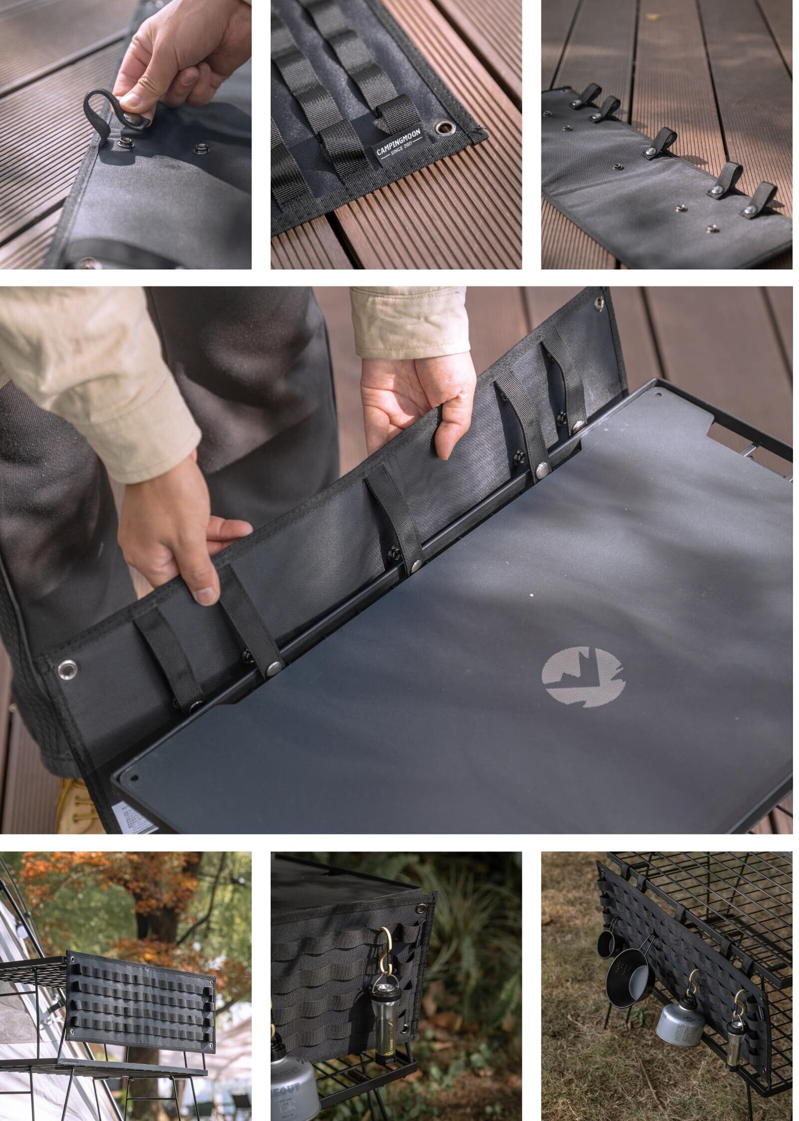 このタクティカルシートは、キャンプテーブルやフィールドラックにしっかりフィットするサイズ設計で、簡単に装着できます。特別な工具は必要なく、数秒でセッティングできる手軽さが魅力です。これにより、素早く快適なキャンプ環境を整え、より楽しい時間を過ごすことができます!