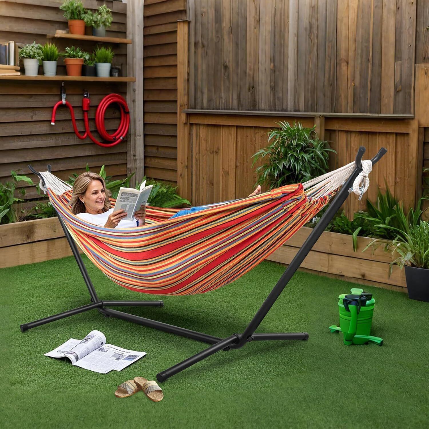[ユーザーの利便性]: ハンモック(ダブル)は自然な色合いで、心地よい自然の中でくつろぎを感じることができます。スタンドの組み立ても簡単で、高さの調節も可能です。吊り下げ式と自立式の両方があり、室内、キャンプ、ピクニック、ハイキング、バーベキューなど、さまざまなシーンで活用できます。