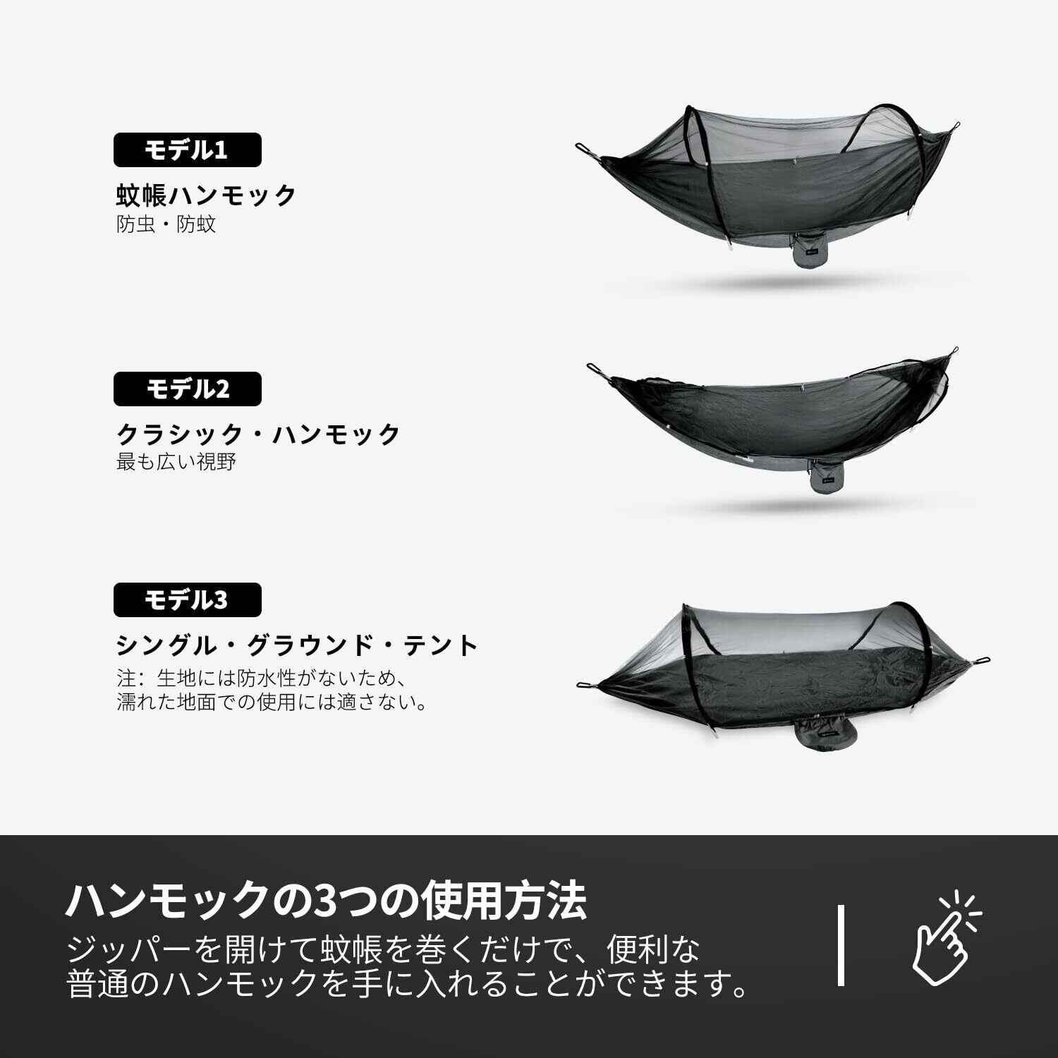 - 付属品:モスキートネット、収納バッグ