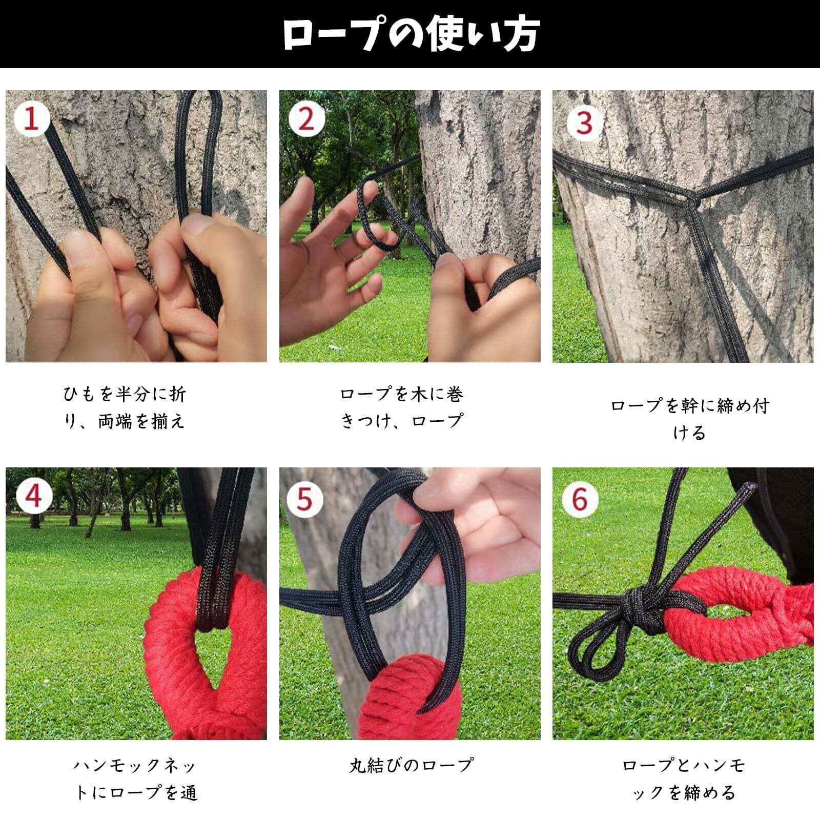 アウトドア用ハンモックのサイズは200*100 cm、荷重400 kgです。パッケージにはハンモック、2つのフック、太いロープ、収納袋が含まれています。従来のハンモックに比べ、両端に木枠が付いた新しいデザインです。寝返りを打っても転ぶ心配がない安心感がさらにアップです。そして、木枠があるのでハンモックの両端のロープが結び付いたり、絡まったりすることはありません。綿&麻素材を用いて作られたハンモックは、綿素材特有の通気性があり、ソフトな手触りで快適に眠ることがポイントです。吸湿性に優れているので、日差しの強い暑い日に汗をかいても快適!全身をすっぽり包み込むタイプで、ゆったりと眠ることができます。季節を問わず、キャンプ、ピクニック、遠足、バーベキューなど、さまざまな場所で利用できます。体を揺らしながら、自然の中で心が癒されます。取り付けが便利で、18個の調整可能なベルトがハンモックの取り付け時により楽になります。また、ベルト式なので木を傷つけません。