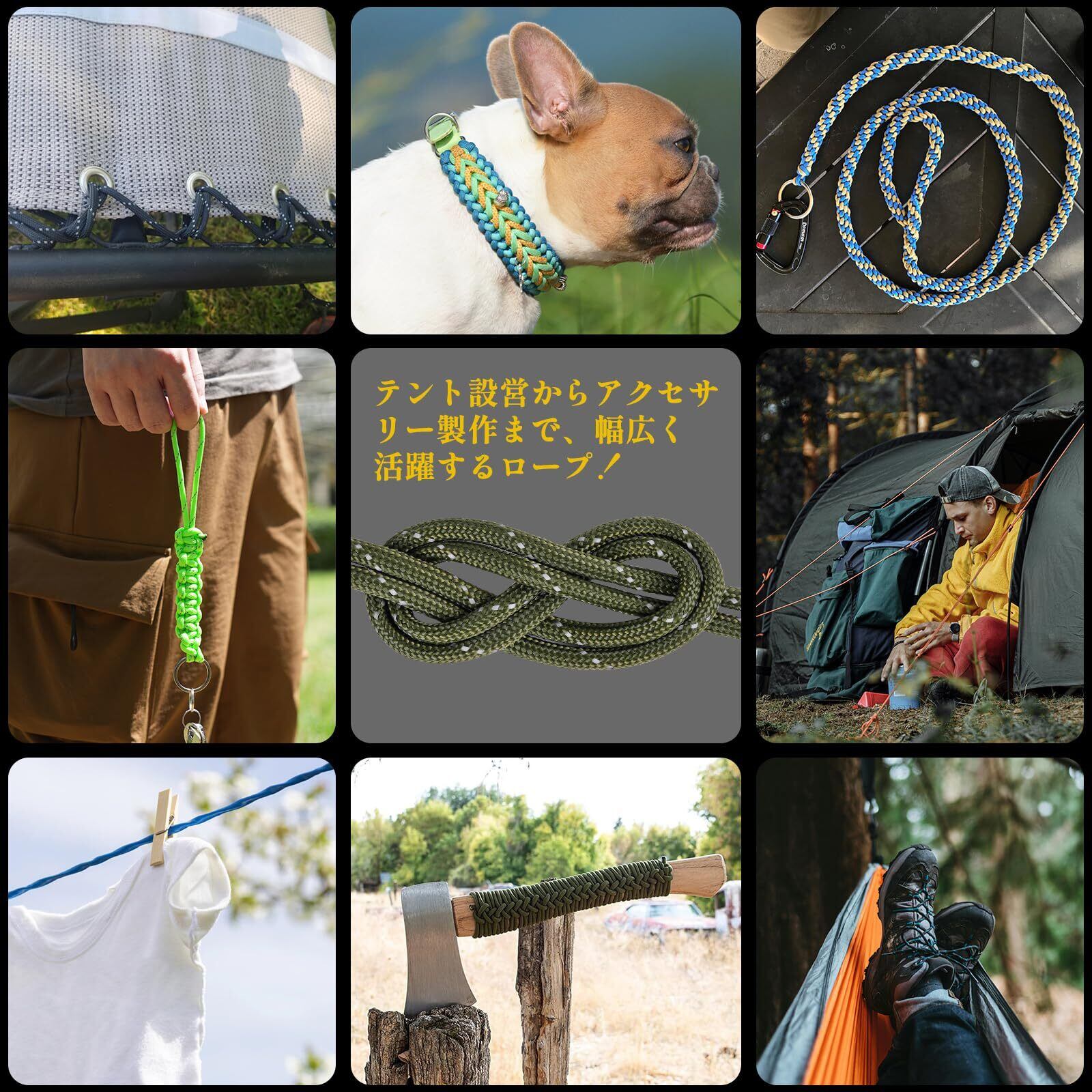 【アウトドア・インドアに欠かせないアイテム】 このキャンプロープは、テント固定用ロープや物干しロープ、ハンモック固定ロープ、シェードロープとしてはもちろん、日常生活でも大活躍します。靴紐やブランコの吊り紐、ペットの首輪やリード、さらにはナイフや手斧などの道具の柄の飾りとしても汎用性が高いです。サバイバル、ハイキング、狩り、釣り、アドベンチャースポーツから家庭用まで、幅広く活用可能です。アウトドア愛好者やDIYに熱心な方に最適なマルチロープです。