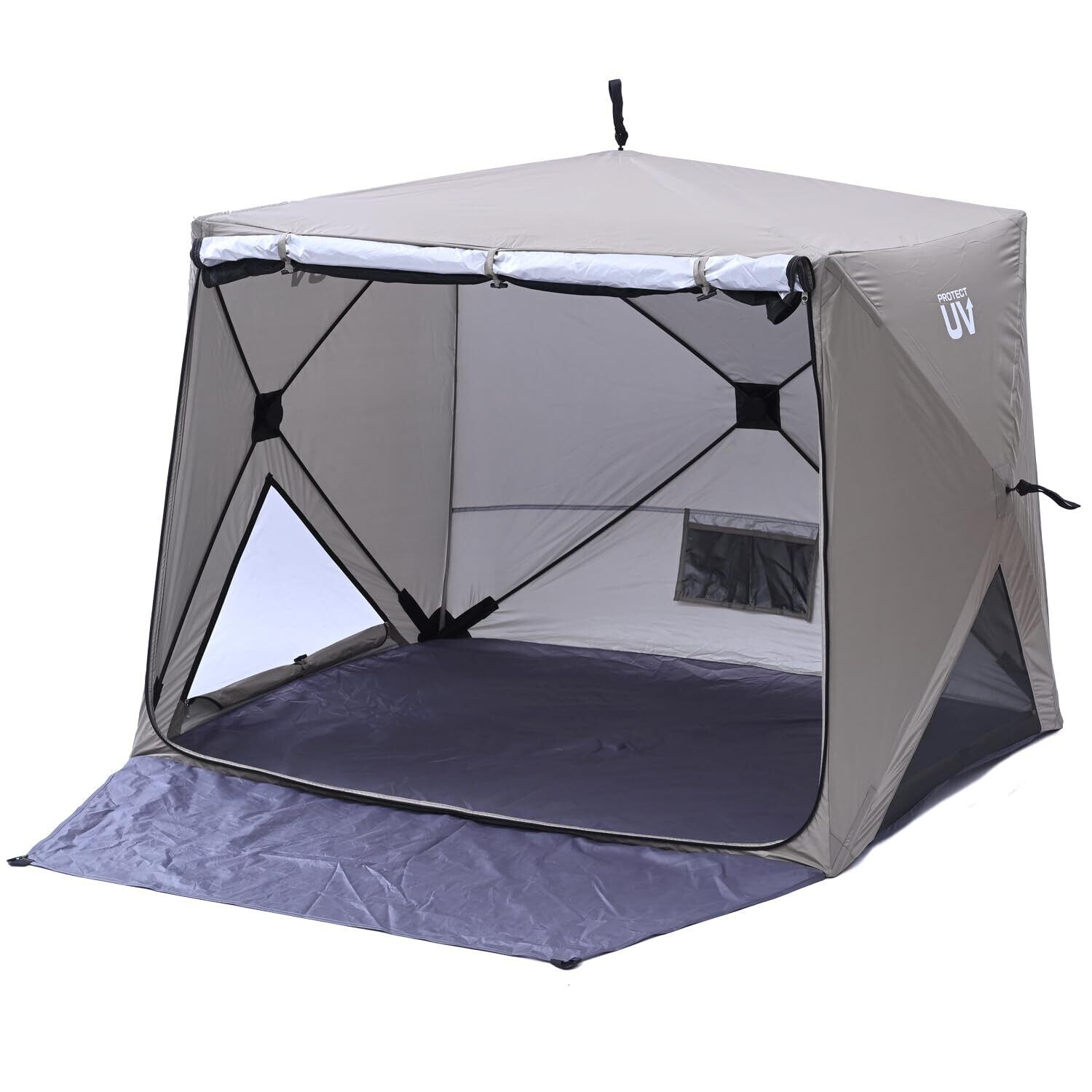 サンシェードとしても多用途に使えるこのテントは、フルクローズ機能を備えているためプライバシーも確保できます。メッシュが施されていることで、虫からの侵入を防ぎつつも快適な通気性を実現。アウトドアの楽しさを妨げることはありません。日差しが強い日でも、しっかりとしたシェイド効果が得られます!