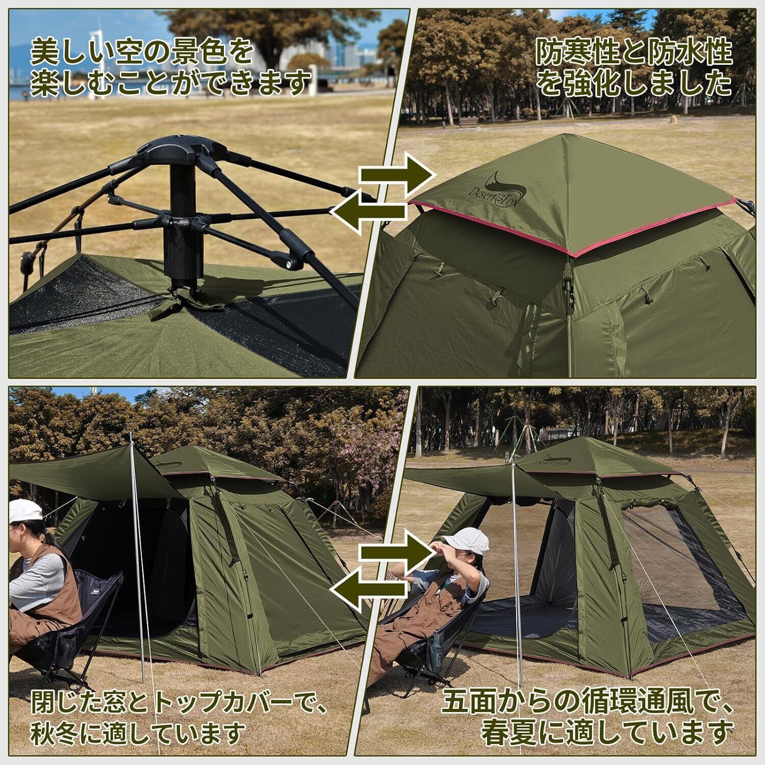 【四方向に大きく広い窓を設置し、テントのトップカバーを分離可能で&四季に対応】200cm x 200cmのスペースはとても広々としていて、4人家族が横になったり座ったりするのに非常に快適です。テントのトップカバーを1.25cmに高くして、圧迫感や蒸し暑さから解放します。◆【五面からの循環通風で、蚊や虫を防ぎ、春夏に適しています】暑い夏により通気性が良く、蒸し暑さを防ぎ、遠くの景色をよりよく眺めることができます。蚊や虫の侵入を防ぎ、キャンプをより安全にします。◆【閉じた窓とトップカバーで、密閉性と保温性が最高に達し、秋冬に適しています】プライバシーを守り、雨水の侵入を防ぎ、秋冬のアウトドアキャンプをより暖かくします。◆テントのトップカバーを分離することで、通気性と快適さが大幅に向上し、雨を防ぐ保温効果もあります。◆【アップグレードされたファイバーフレーム】:強靭な耐風フレームで、5~6級の強風に耐えることができます。