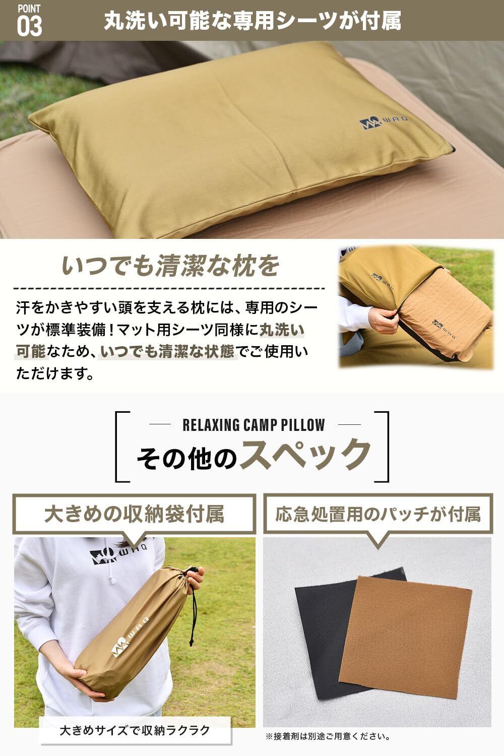 人気のアウトドアブランド【WAQ】から快適な睡眠をサポートする 車中泊・キャンプマットが登場!アウトドアに必需品のまくら です!【キャンプでも睡眠を妥協したくないあなたへ】クッション素材には弾力性に優れているウレタンを使用。エアーによるマットの張りを損なわずウレタンの気持ちいい弾力を実現!【丸洗い可能なシーツが付属】汗をかきやすい頭を支える枕には専用のシーツが標準装備!マット用シーツと同様に丸洗い可能なためいつでも清潔な状態でご使用いただけます。【厚みたっぷりのウレタン】最大7cmの極厚ウレタンがあなたの頭をしっかりサポート。弾力性のある生地と相まって寝心地が更に向上いたしました。【自動膨張】バルブを開くと自動で空気が入ります!さらに高機能バルブを搭載した事で空気の逆流を防ぎ、より効率よく空気を取り込むことが可能に。 ※初回空気入れ時は出荷状態のため空気の入りが遅くなります。