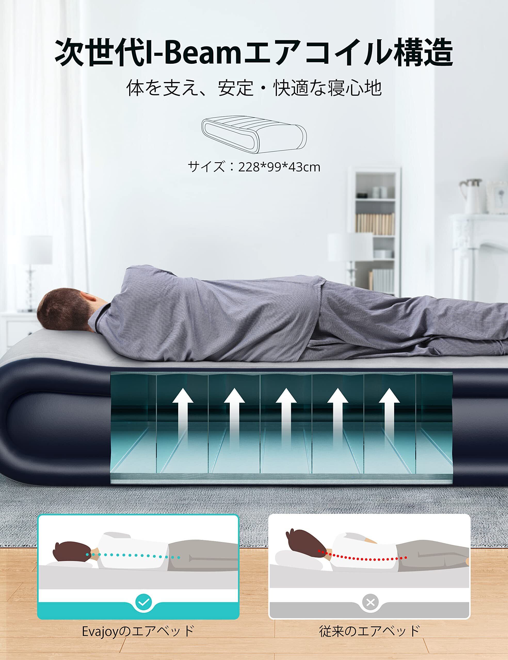 独自の内部構造: このエアマットレスは高品質な素材を使用しており、頻繁な使用にも耐える設計です。特殊なエアコイル構造と強化された縫い目により、優れた安定性と気密性を実現しています