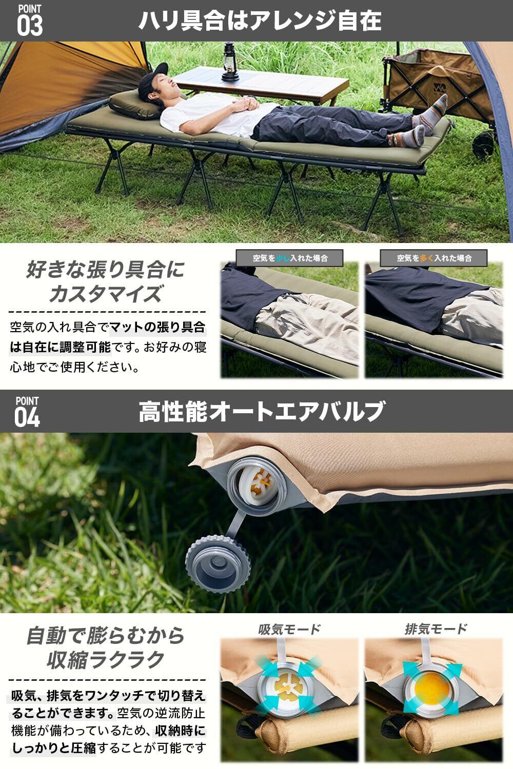 【厚みたっぷりのウレタン】最大8cmの極厚ウレタンがあなたの体をしっかりサポート。弾力性のある生地と相まって寝心地が更に向上いたしました。【自動膨張】バルブを開くと自動で空気が入ります!さらに高機能バルブを搭載した事で空気の逆流を防ぎ、より効率よく空気を取り込むことが可能に。 ※初回空気入れ時は出荷時の圧縮により空気の入りが遅く、時間がかかる場合があります。